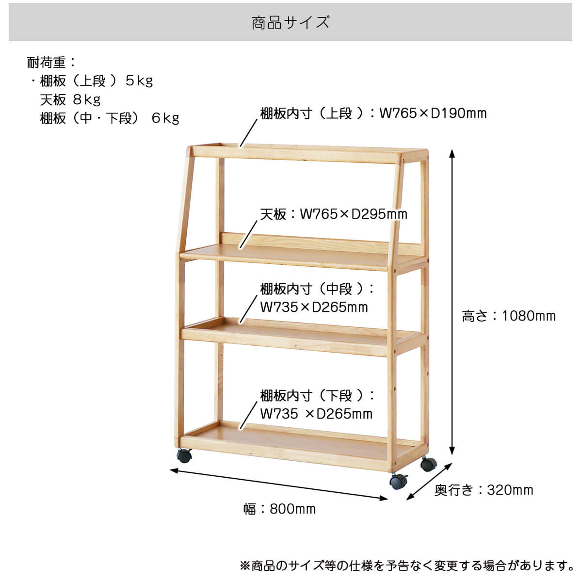 ■耐荷重(約):上段棚板5kg、天板8kg、中段棚板6kg、下段棚板6kg