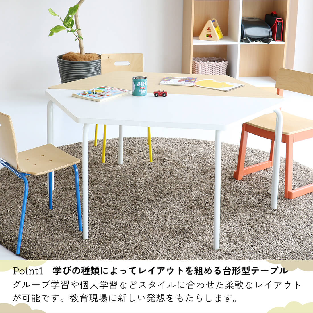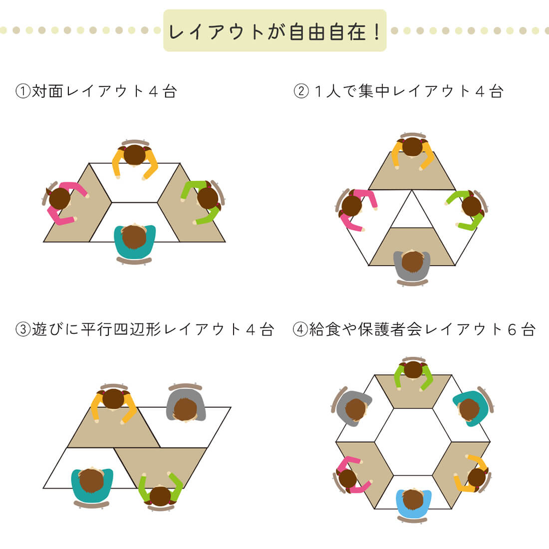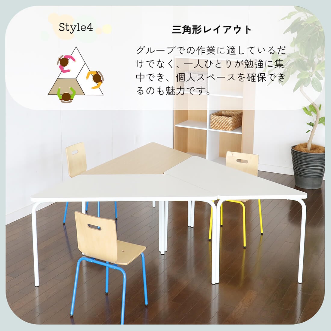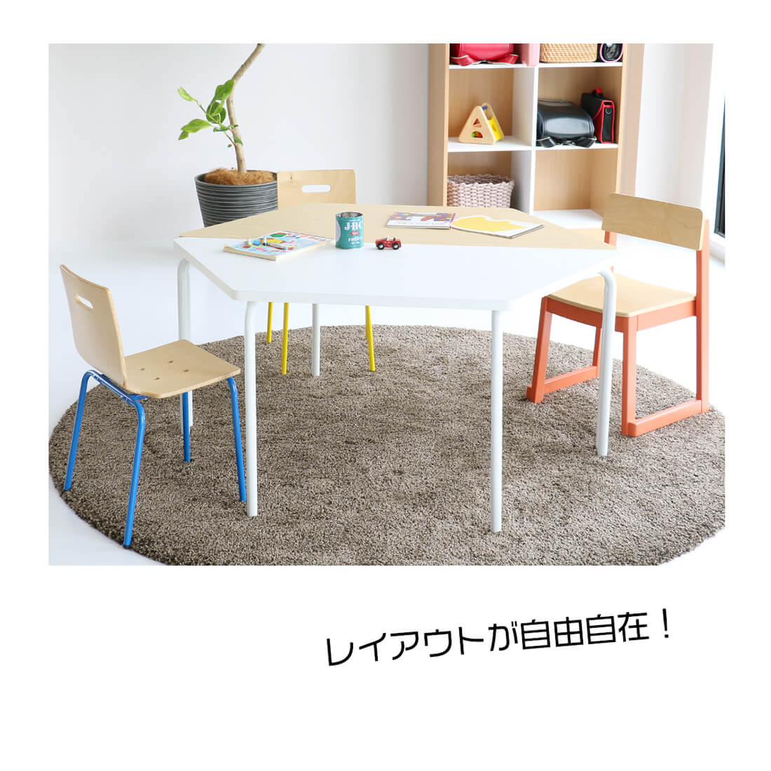 複数台をつなげることにより色んなレイアウトでの設置が可能なので、塾や保育園、幼稚園など様々な場面で学びの空間を作ることができます。