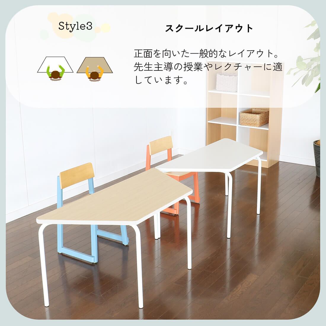 グループ学習や個人学習など、スタイルに合わせて柔軟にレイアウトが可能な120cm幅の台形型テーブル1台単品です。