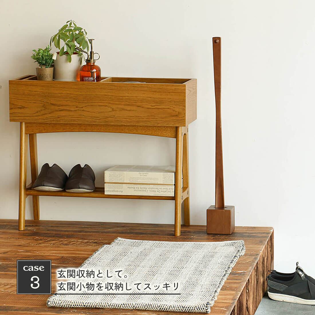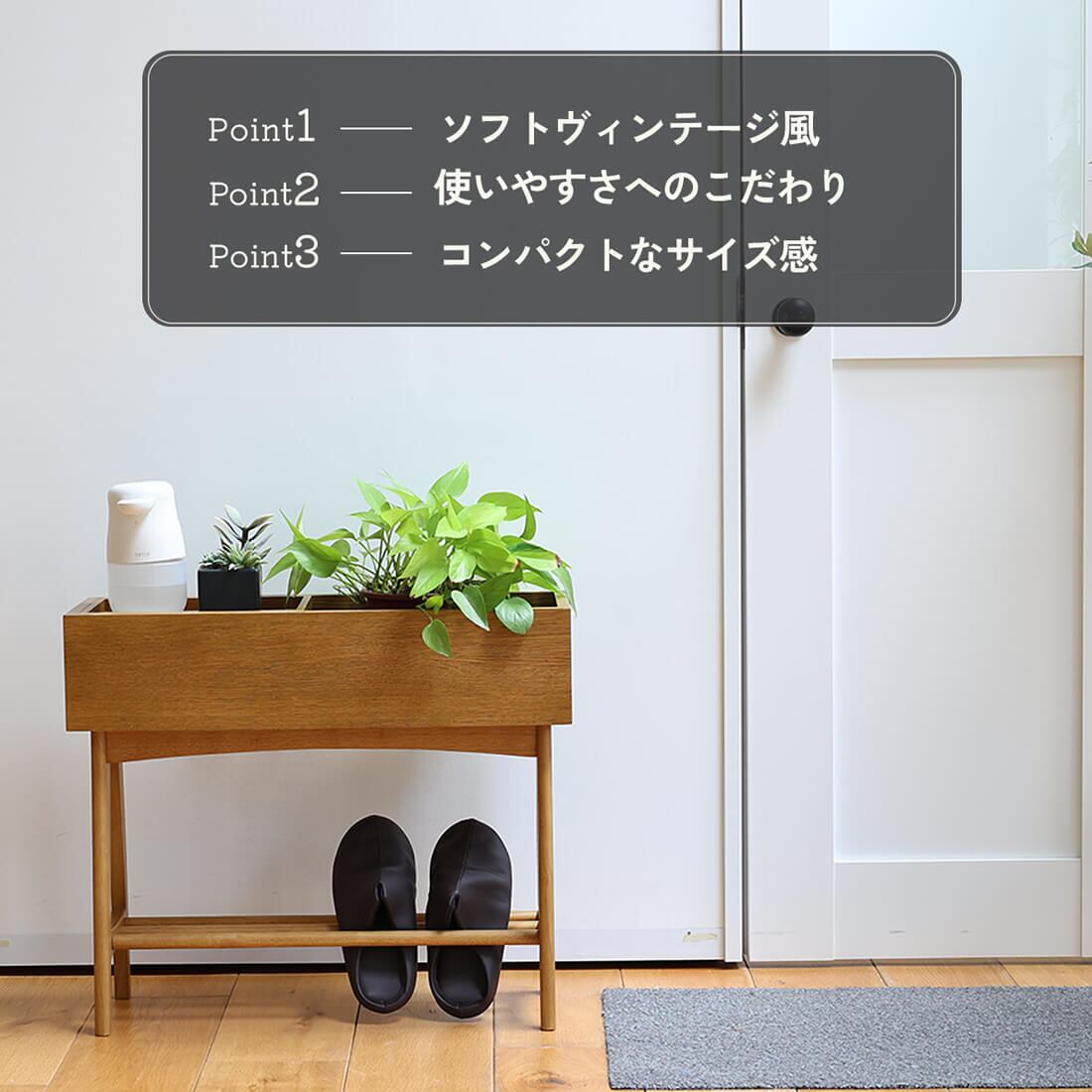 2段収納やサイドテーブル使いとして便利なトレー付きで、下段には棚板付きで一般的なスリッパや収納ボックスを置くことができます。