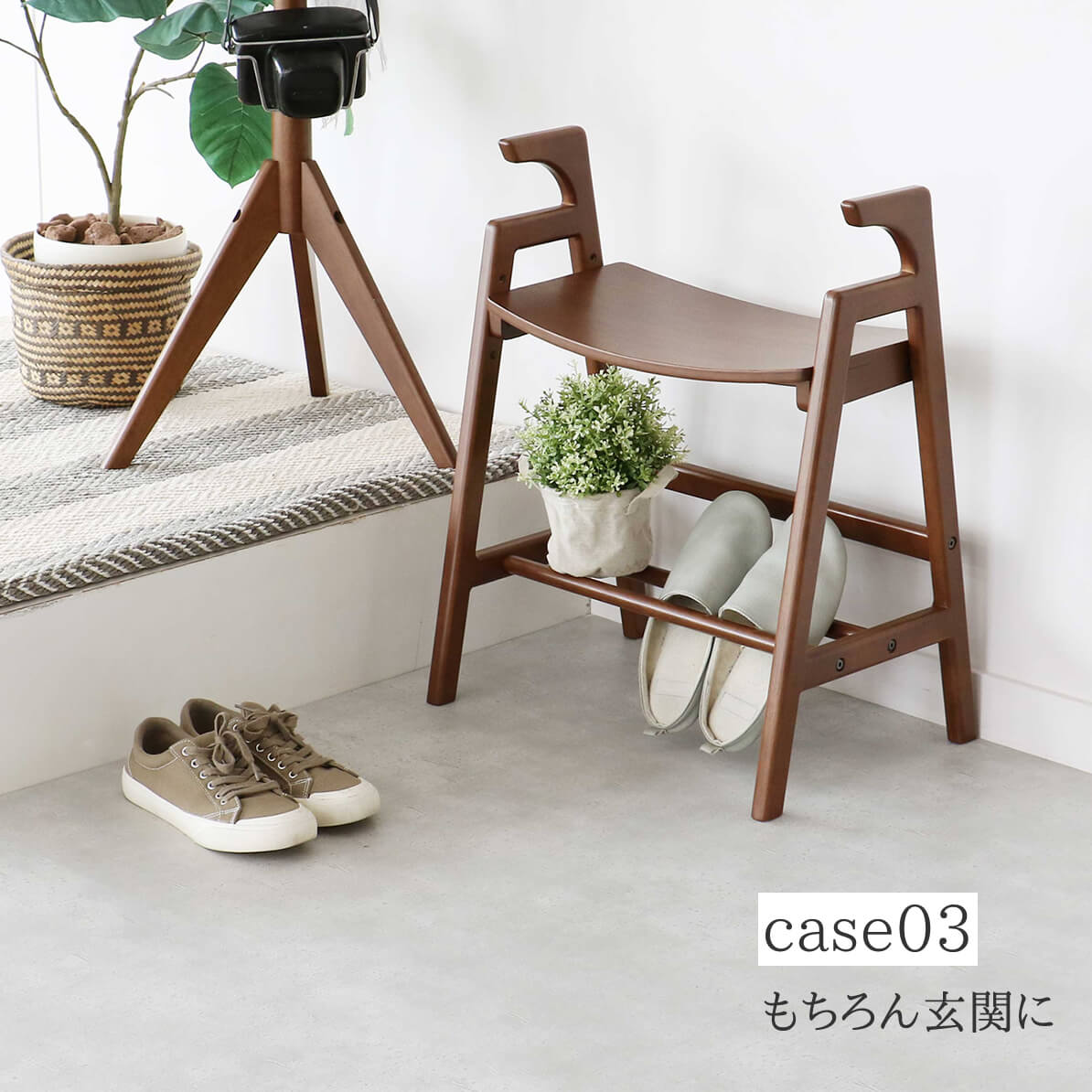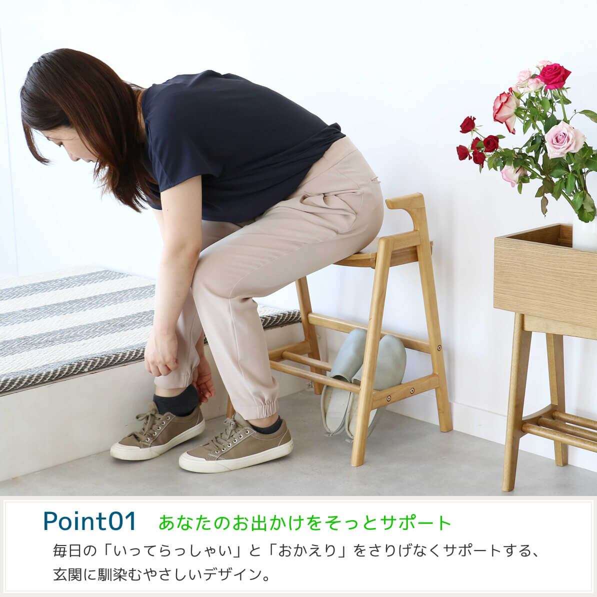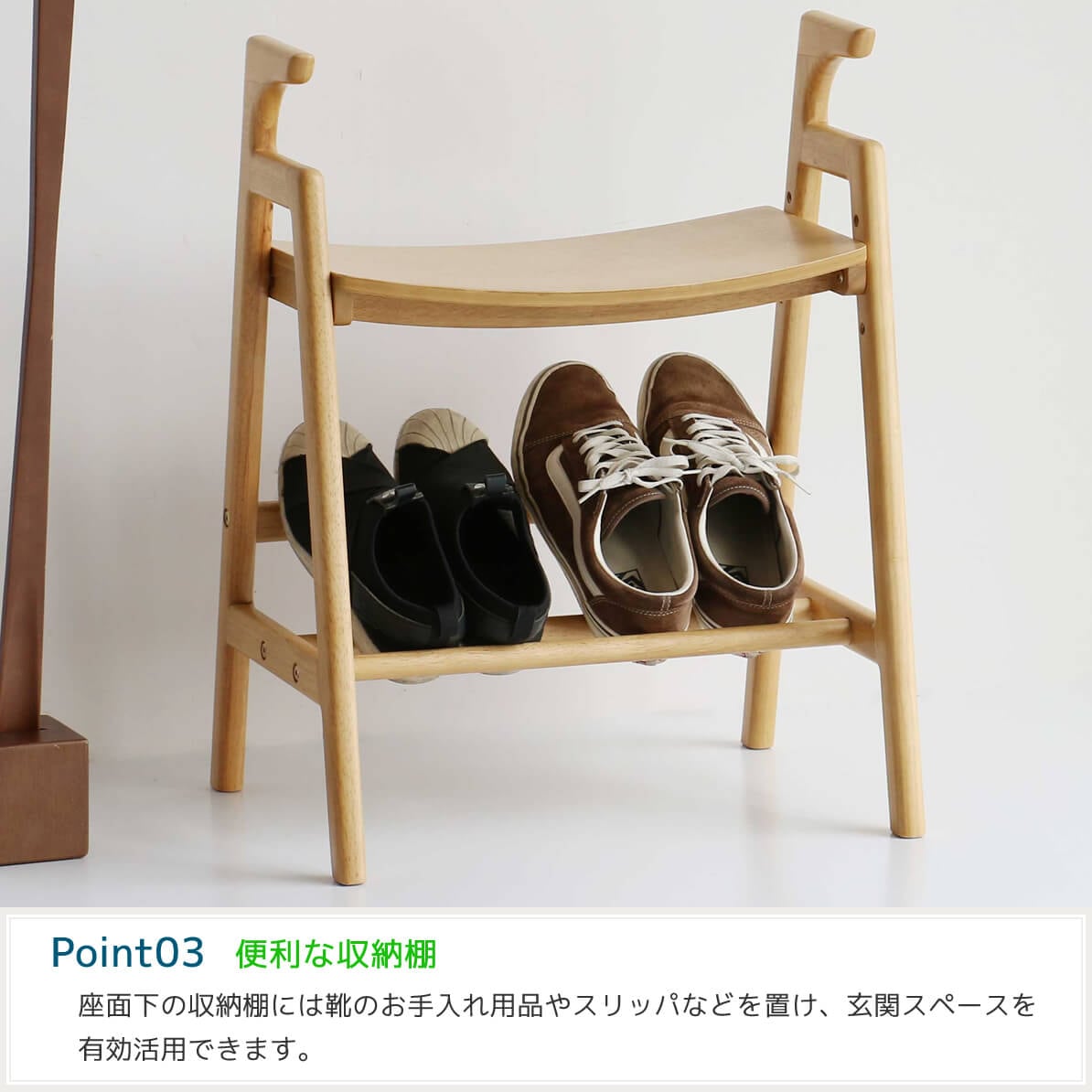 座面下の収納棚には靴屋お手入れ用品やスリッパなどを置くことができ、玄関スペースを有効活用できます。