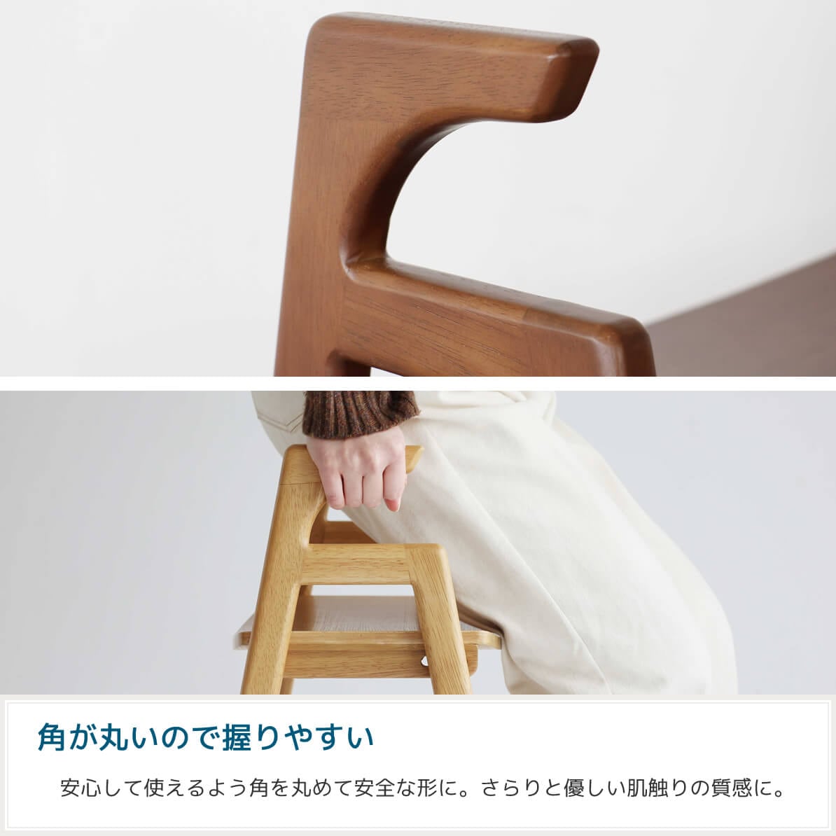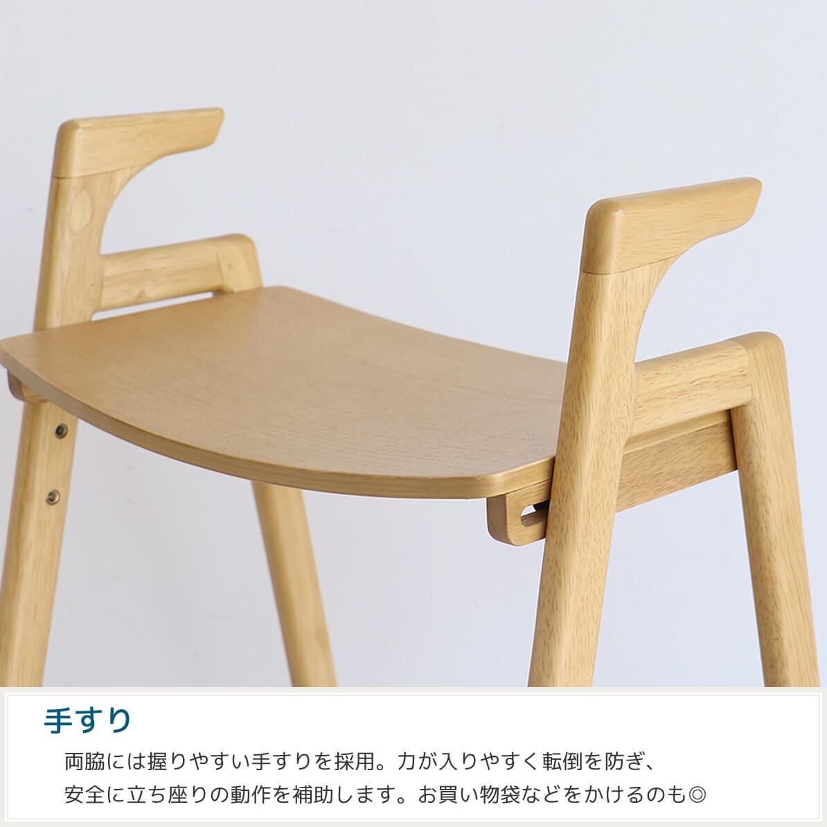 両脇には握りやすい手すりを採用しており、力が入りやすく転倒を防ぎ、安全に立ち座りの動作を補助します。