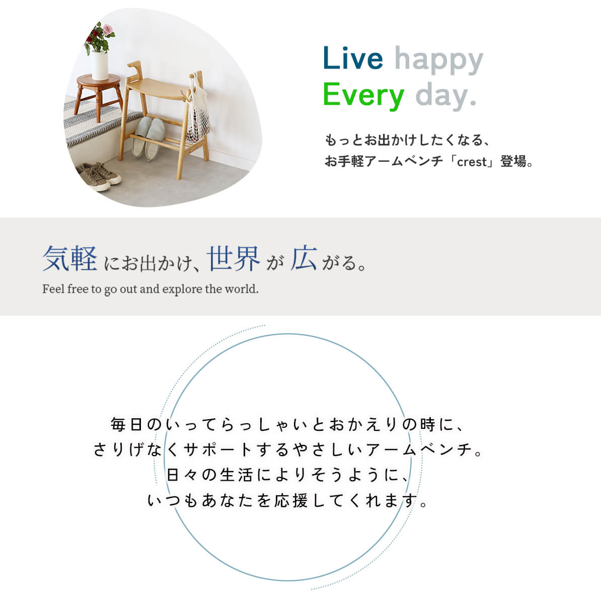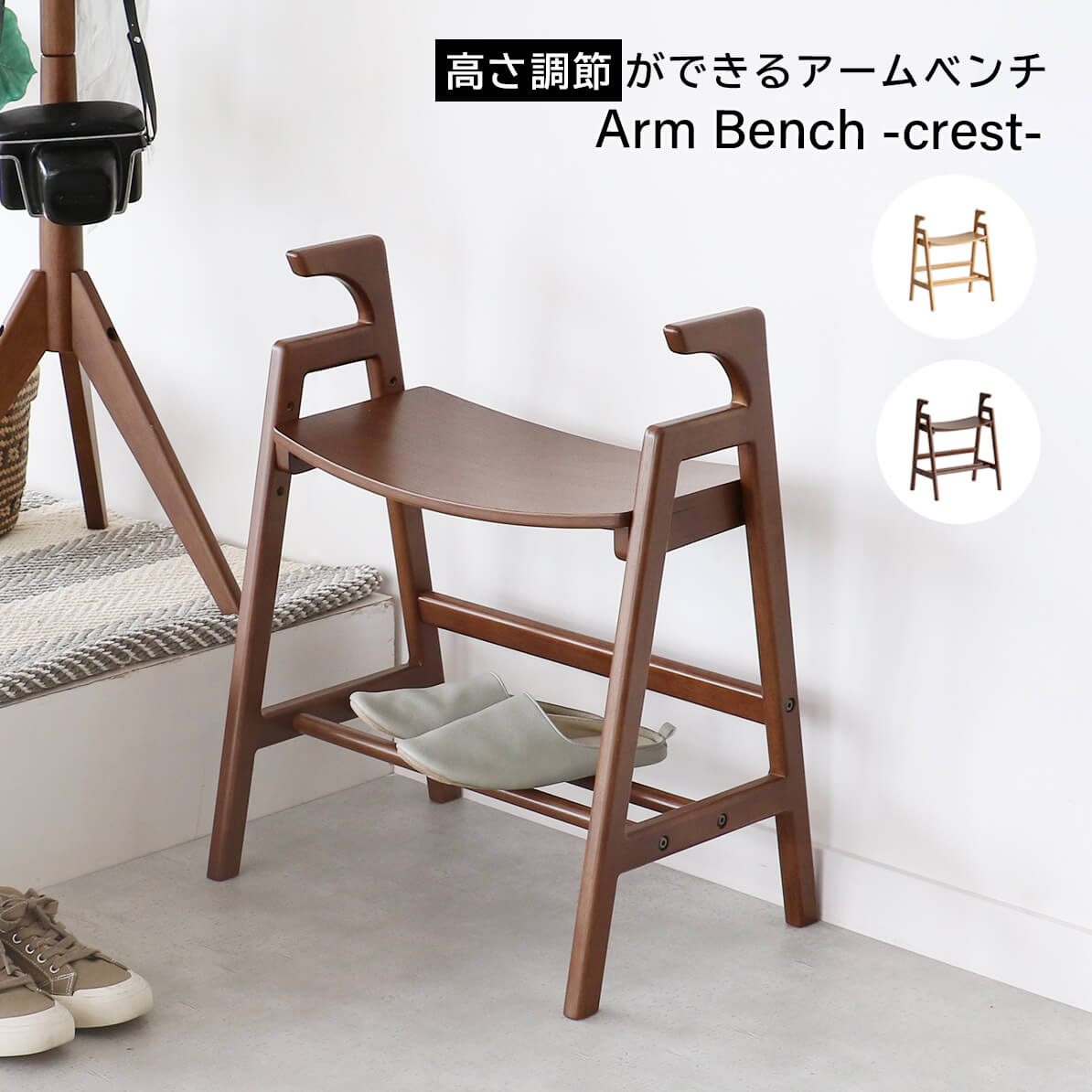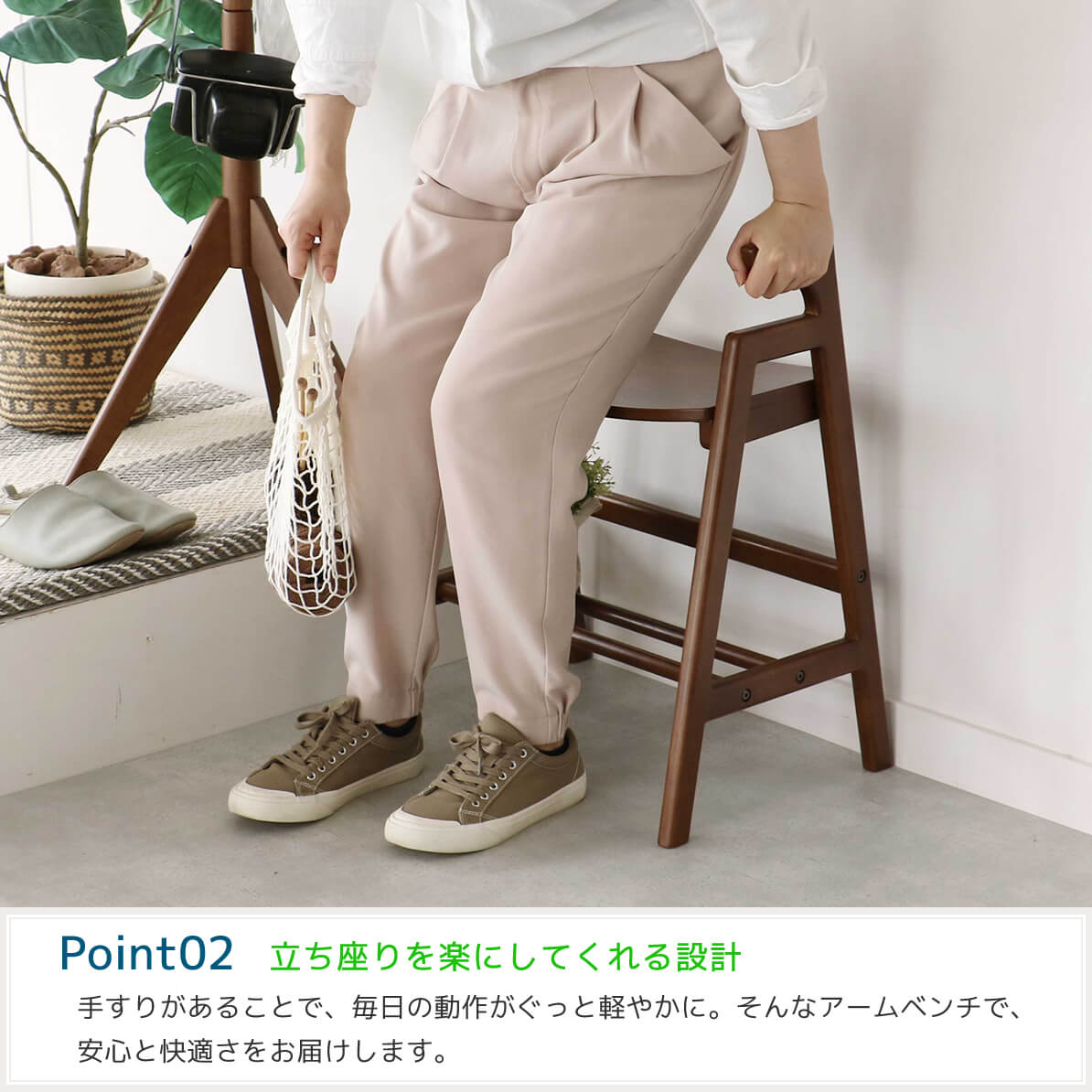 手すりが付いているので、立ち座りの動作がぐっと楽になる48.5cm幅のアームベンチです。