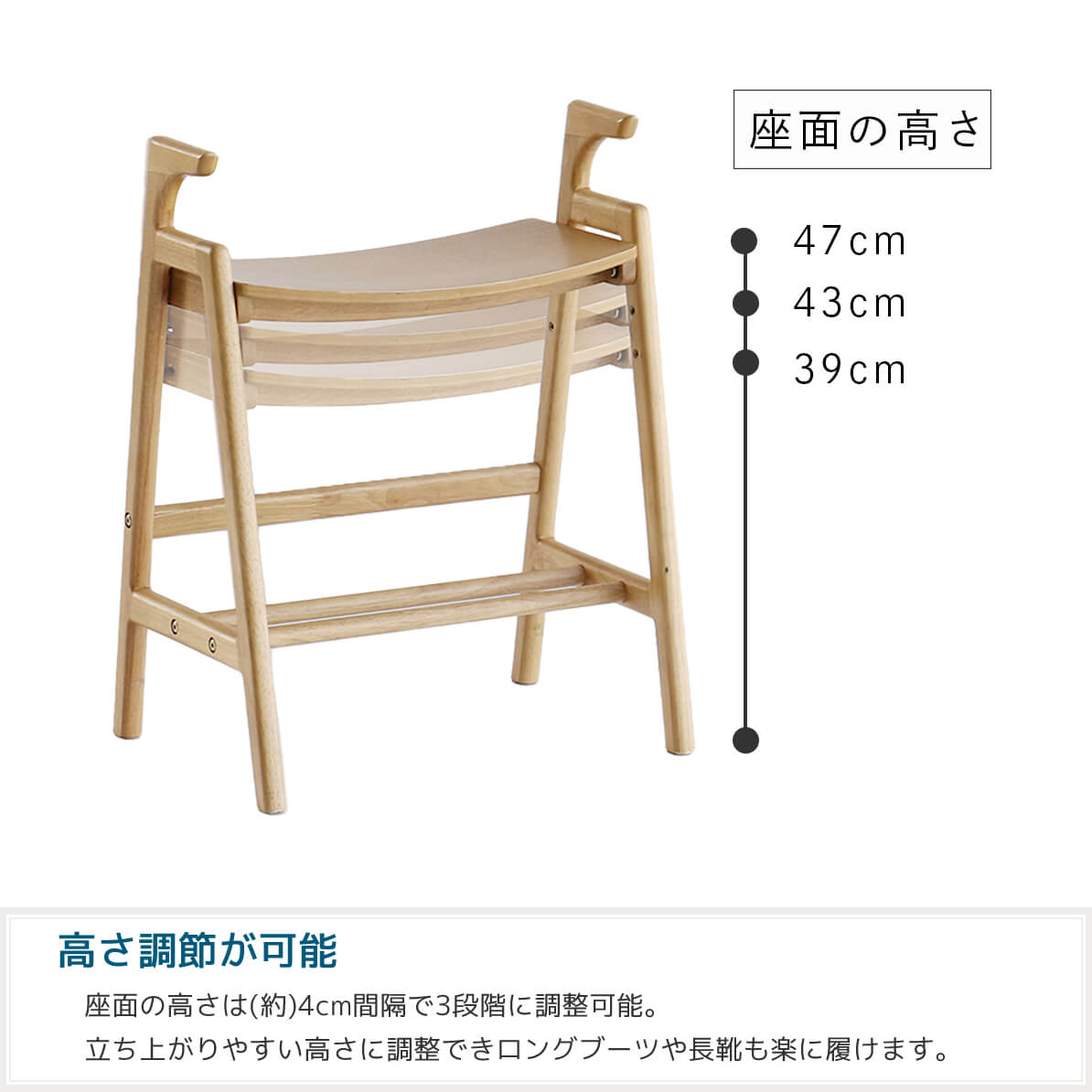 座面の高さが39cm、43cm、47cmと3段階の調整可能です。