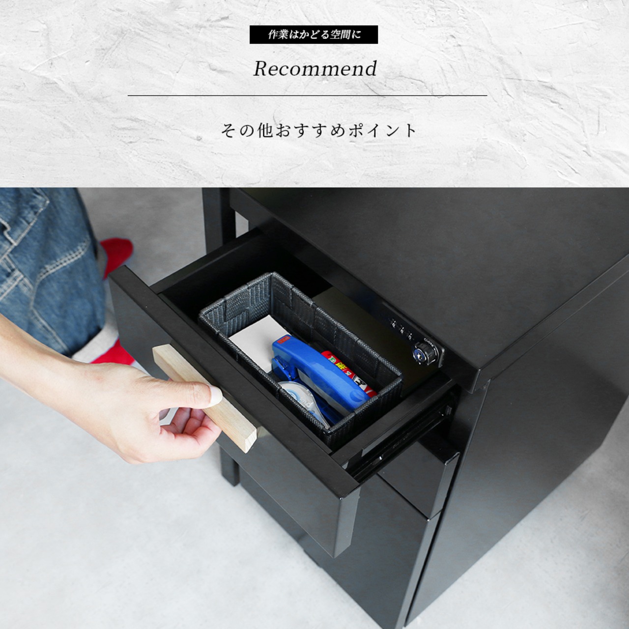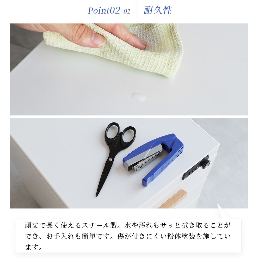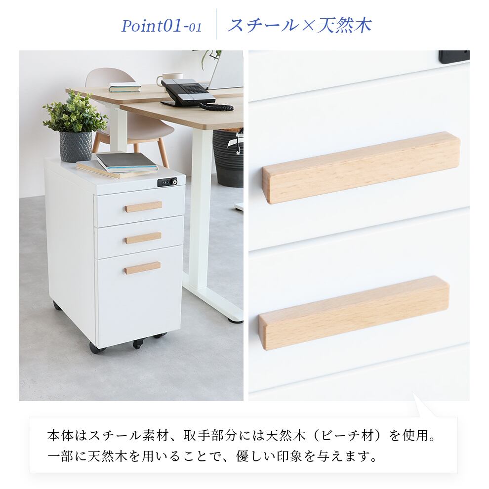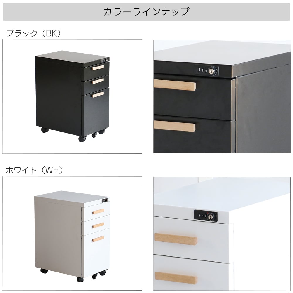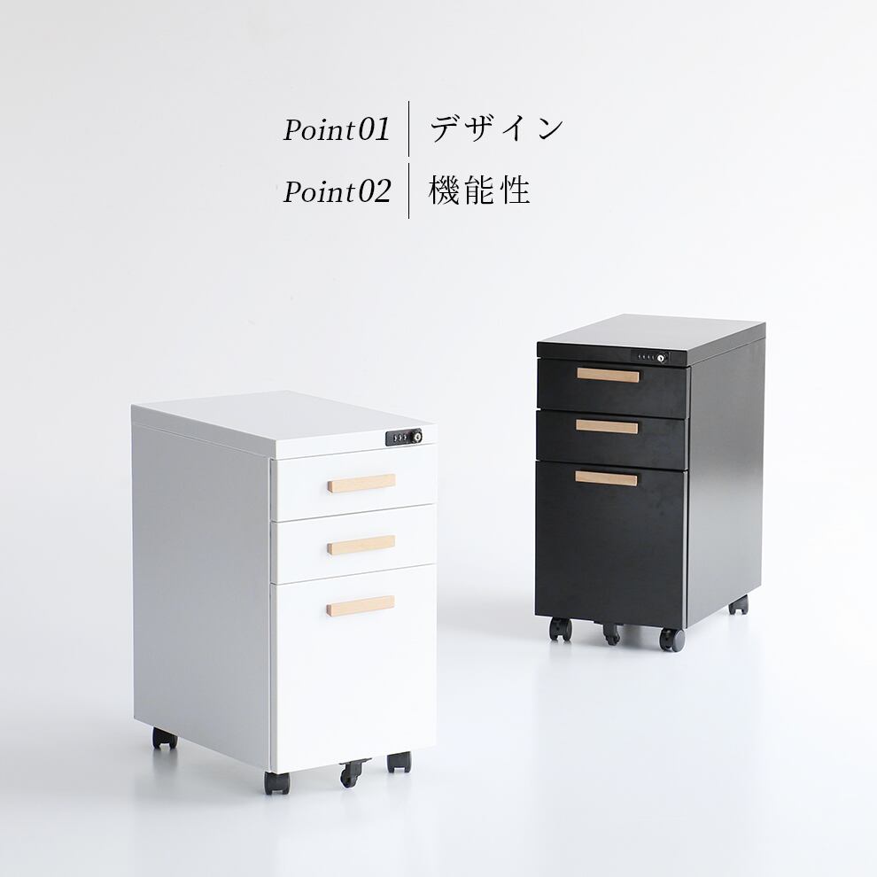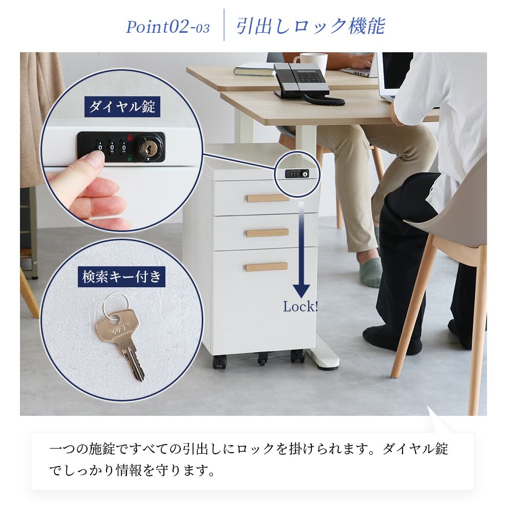 1つの施錠ですべての引き出しにロックをかけることができるダイヤル錠付きのデスクワゴンです。
