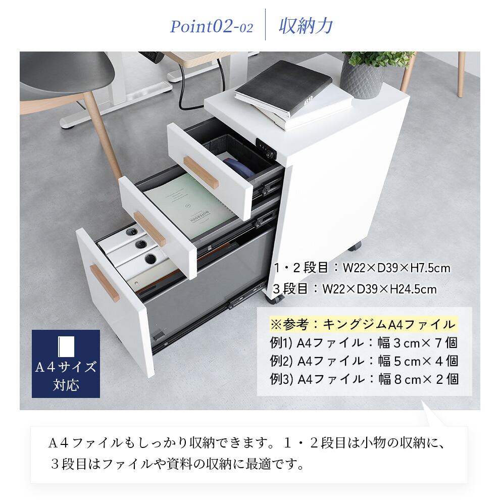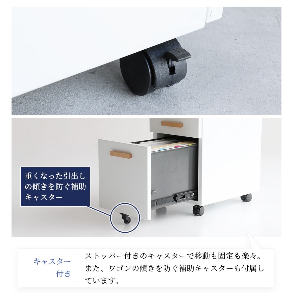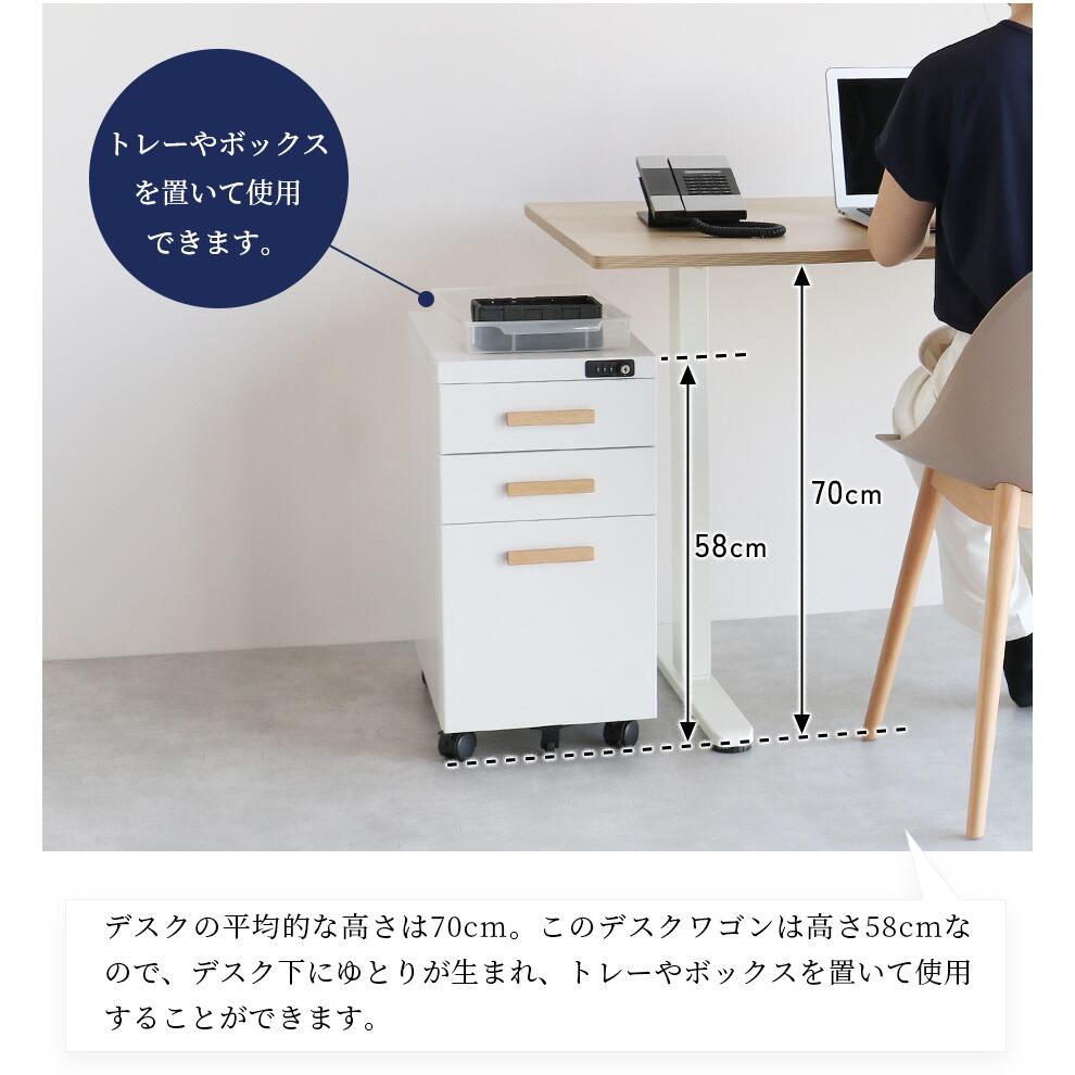 コンパクトなサイズ感でデスクの横や下に置いても場所を取りにくく、高さ(約)58cmで天板にトレーやボックスを置きやすいデスクワゴンです。