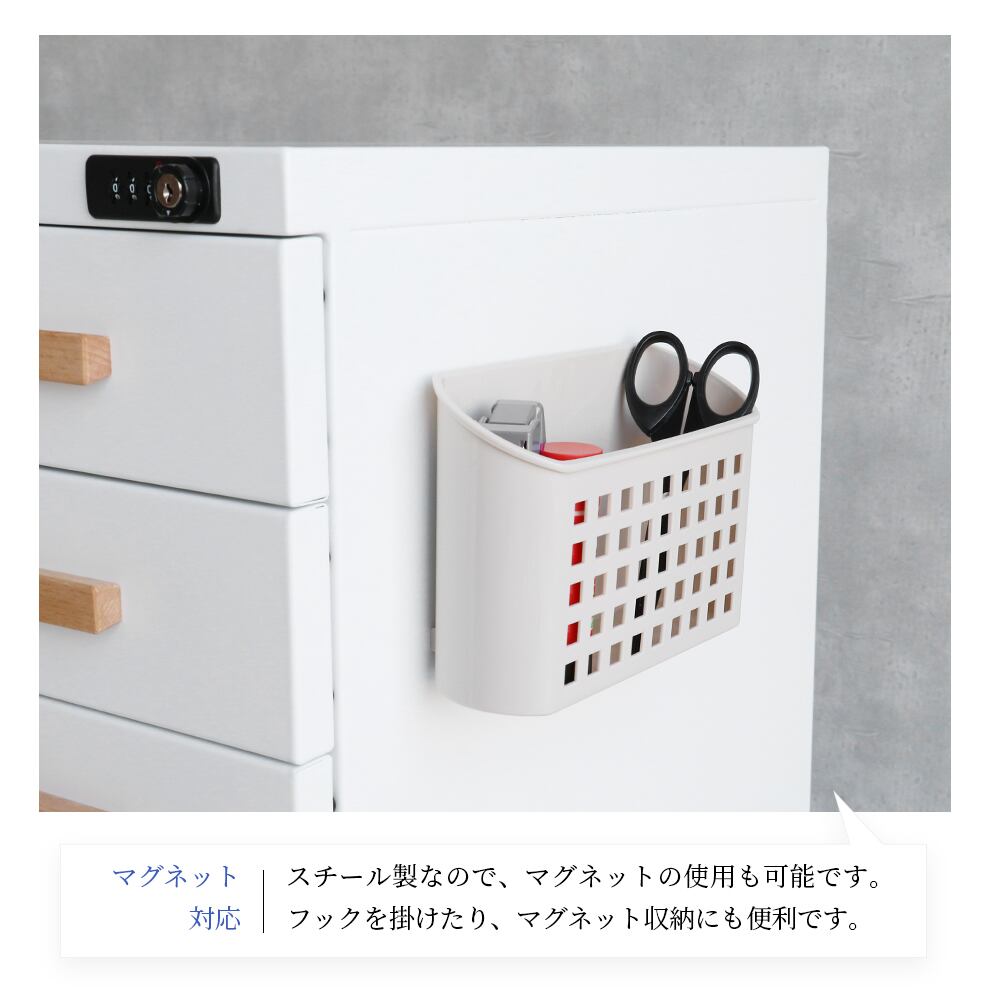 キャスターはストッパー付きで移動も固定も簡単で、本体はスチール製なので、マグネットの使用も可能です。