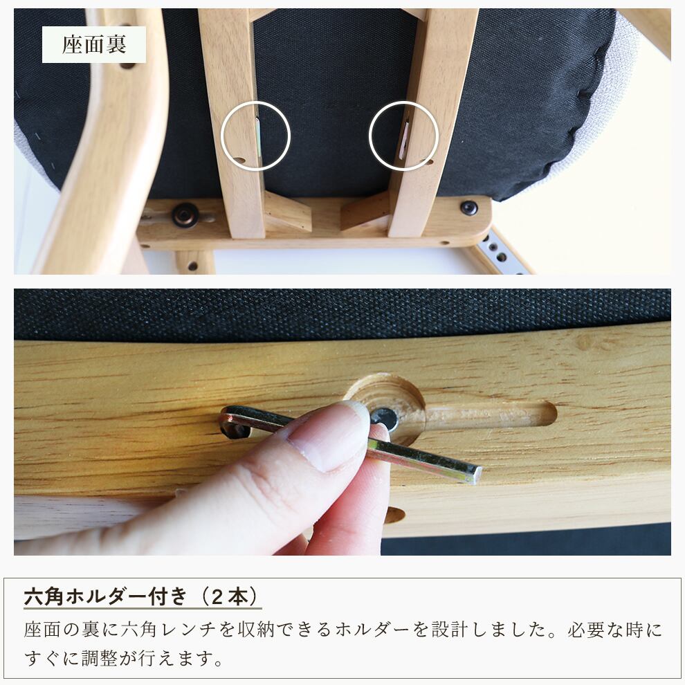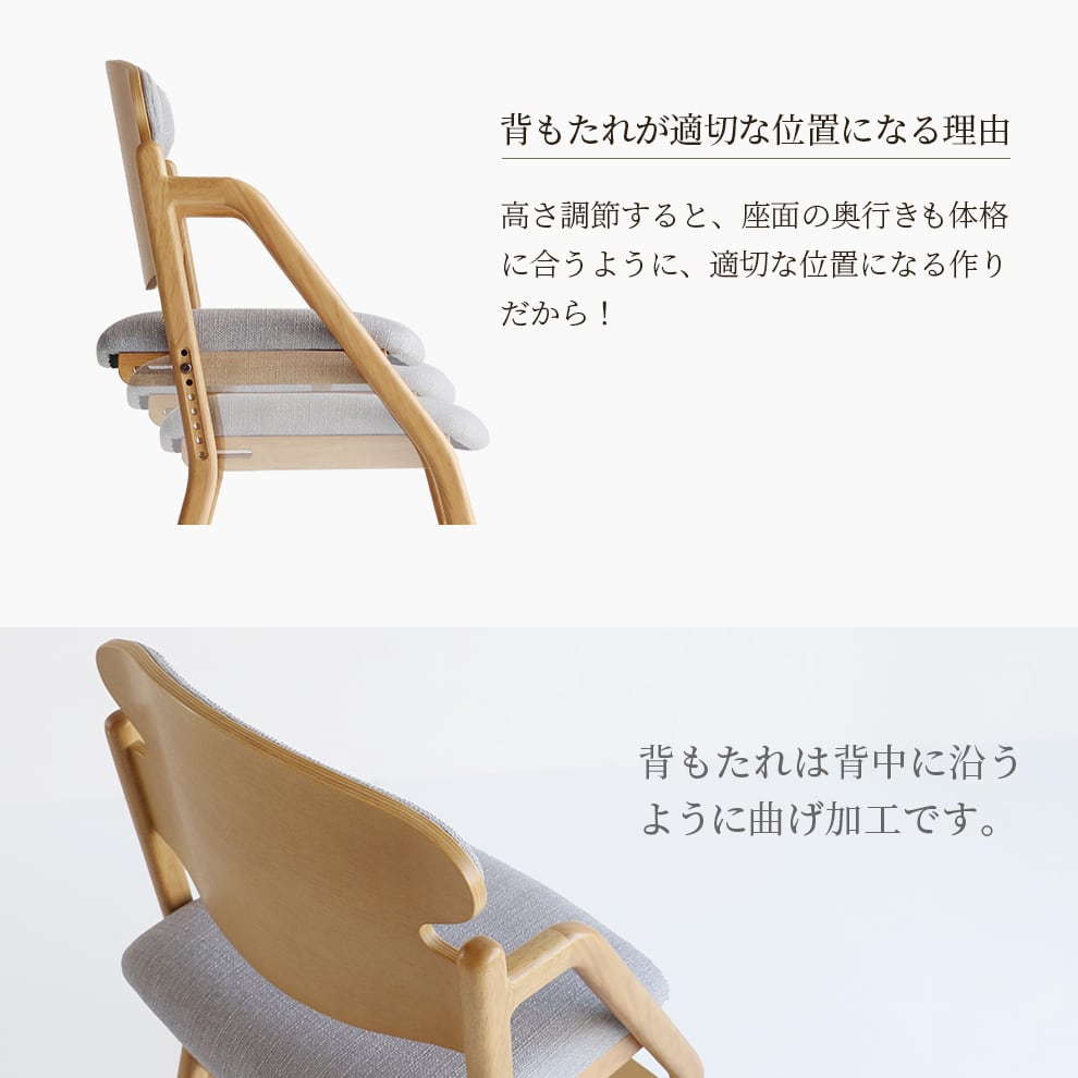 広い背もたれにはファブリック素材を使用しており、長時間の学習でも快適に正しい姿勢を保つことができます。
