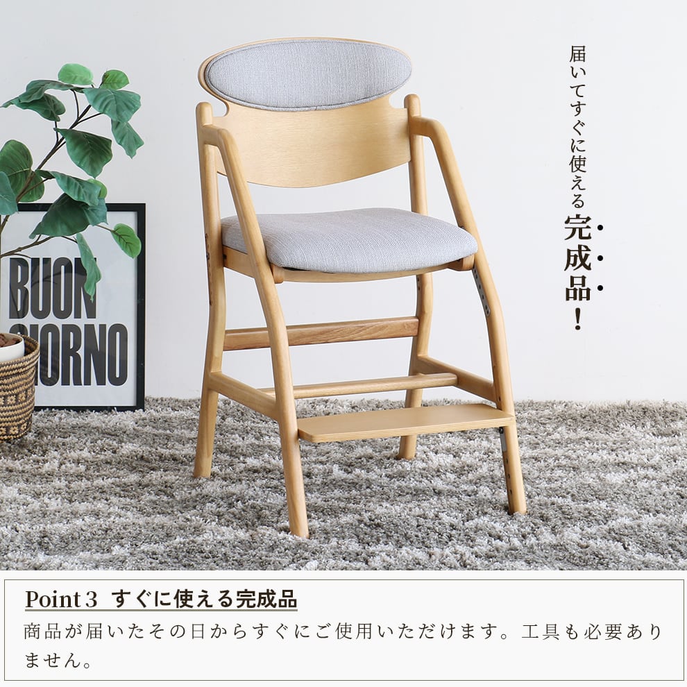 広々とした背もたれがポイントの正しい姿勢を保てるキッズダイニング学習チェア1脚単品です。