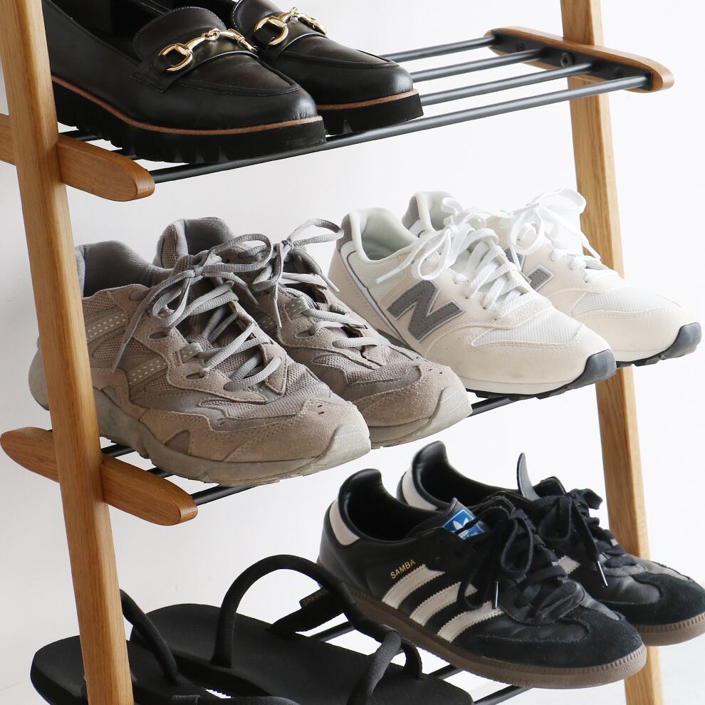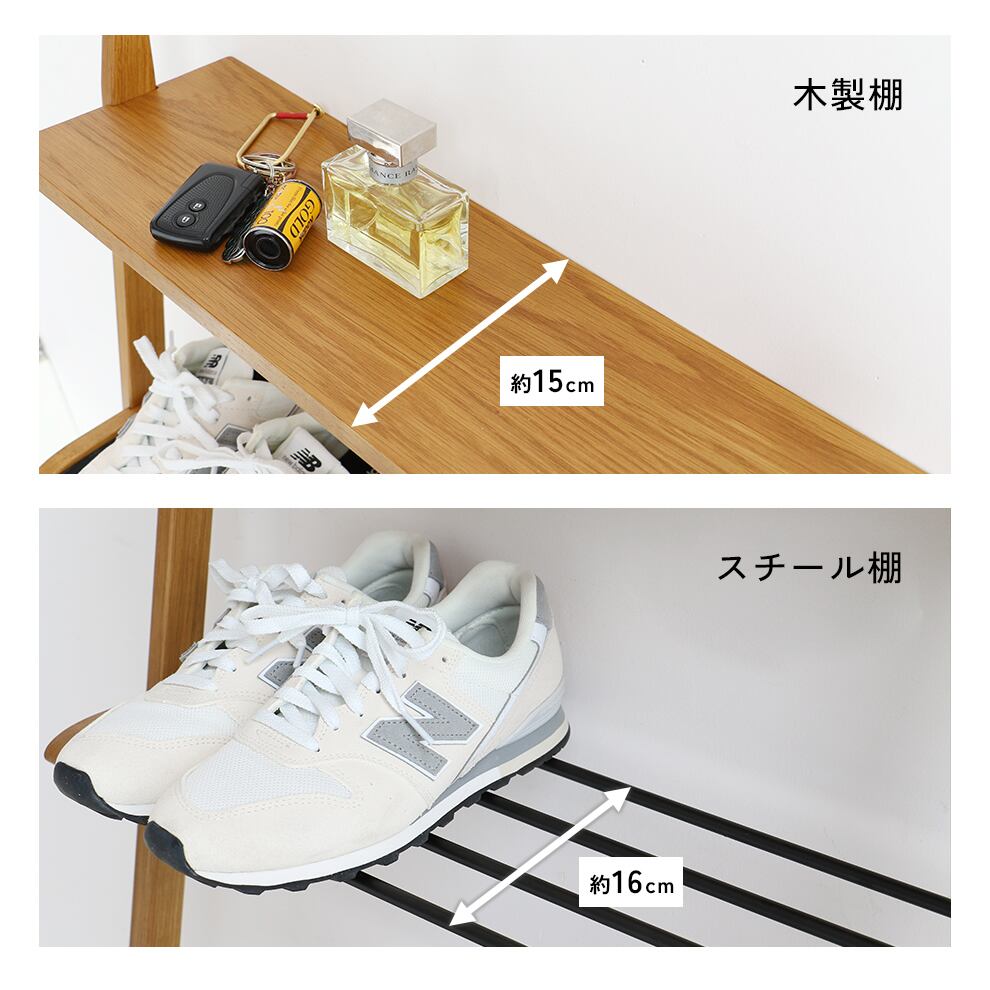 最上段は木製棚、中棚はスチール棚になっているので、最上段はディスプレイラックとして使用しつつ、中棚(スチール棚)にシューズを収納することができます。