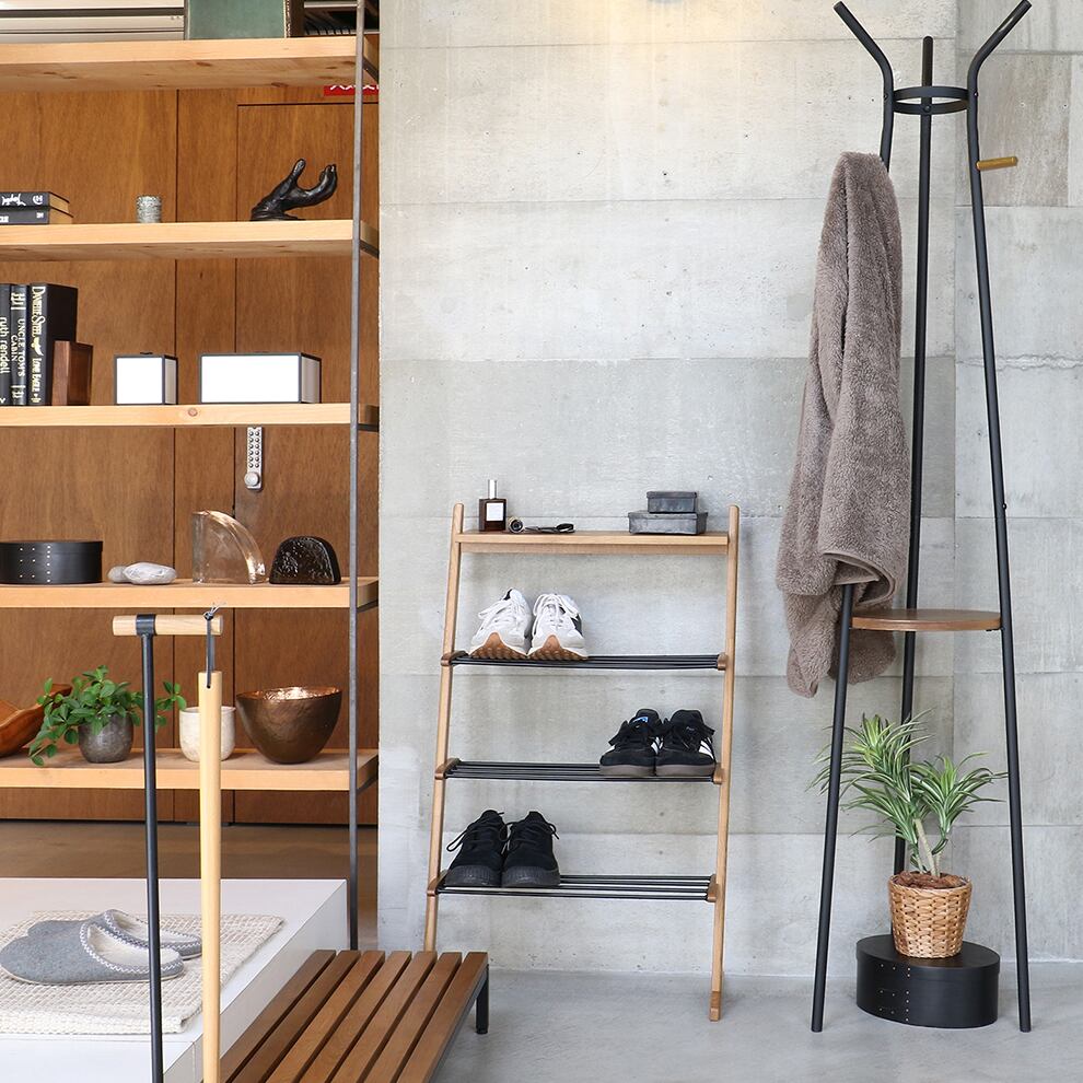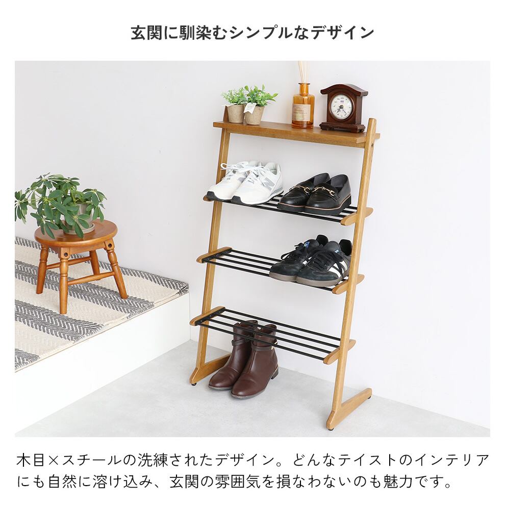 木目とスチールの洗練されたデザインが魅力的な玄関の雰囲気を損なわない53.5cm幅のシューズラックです。