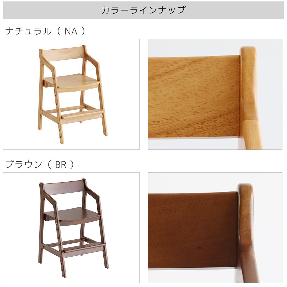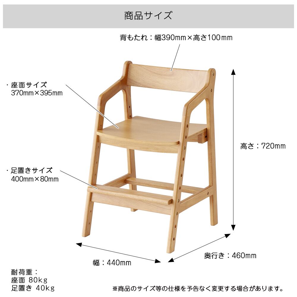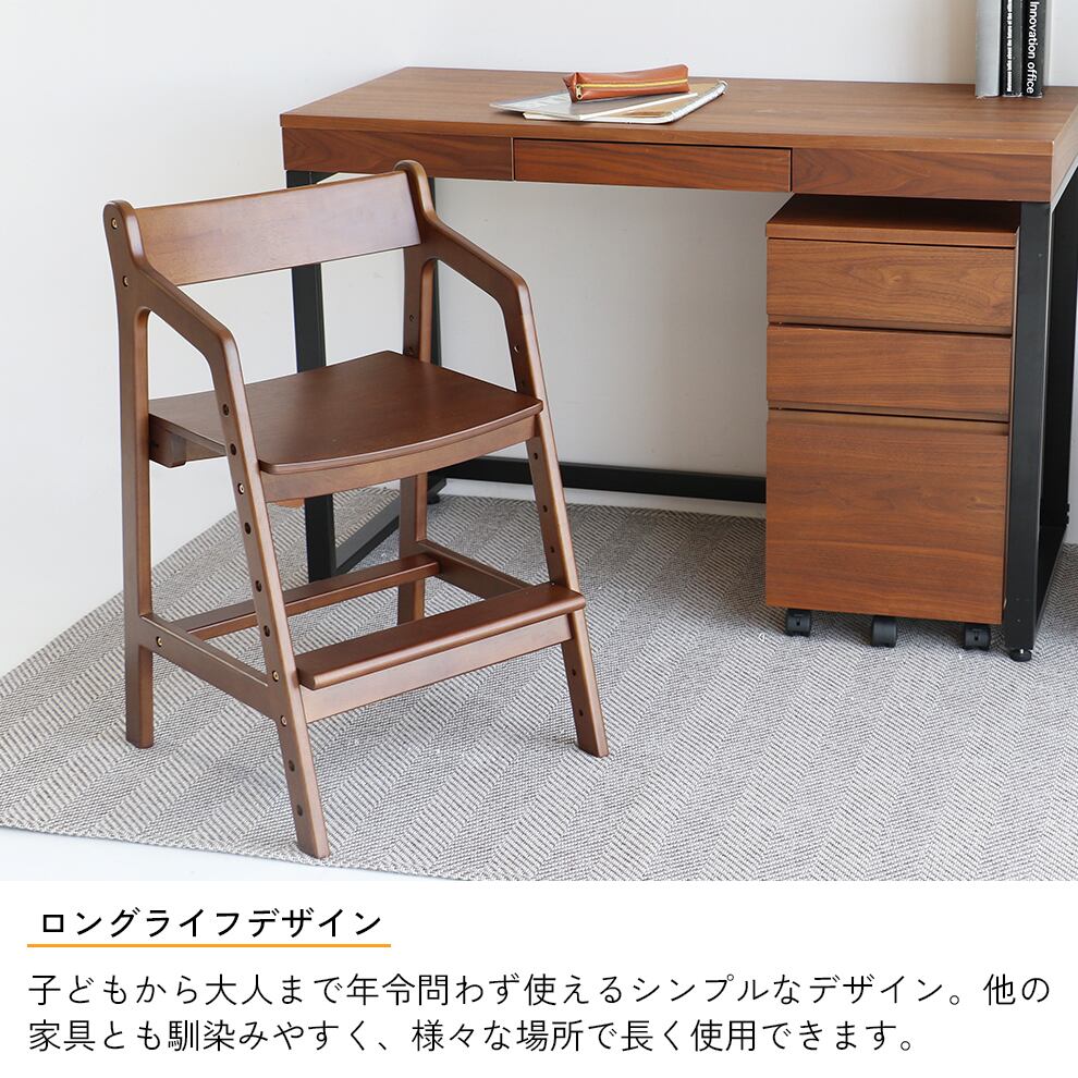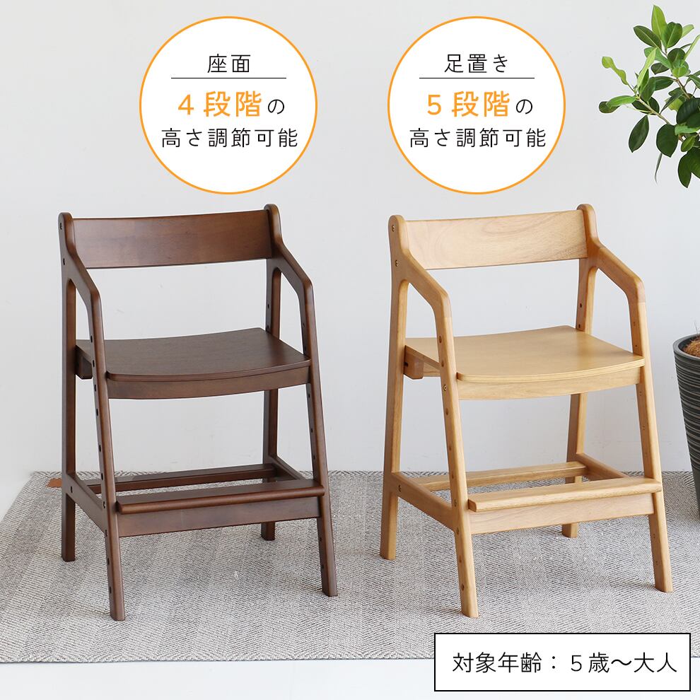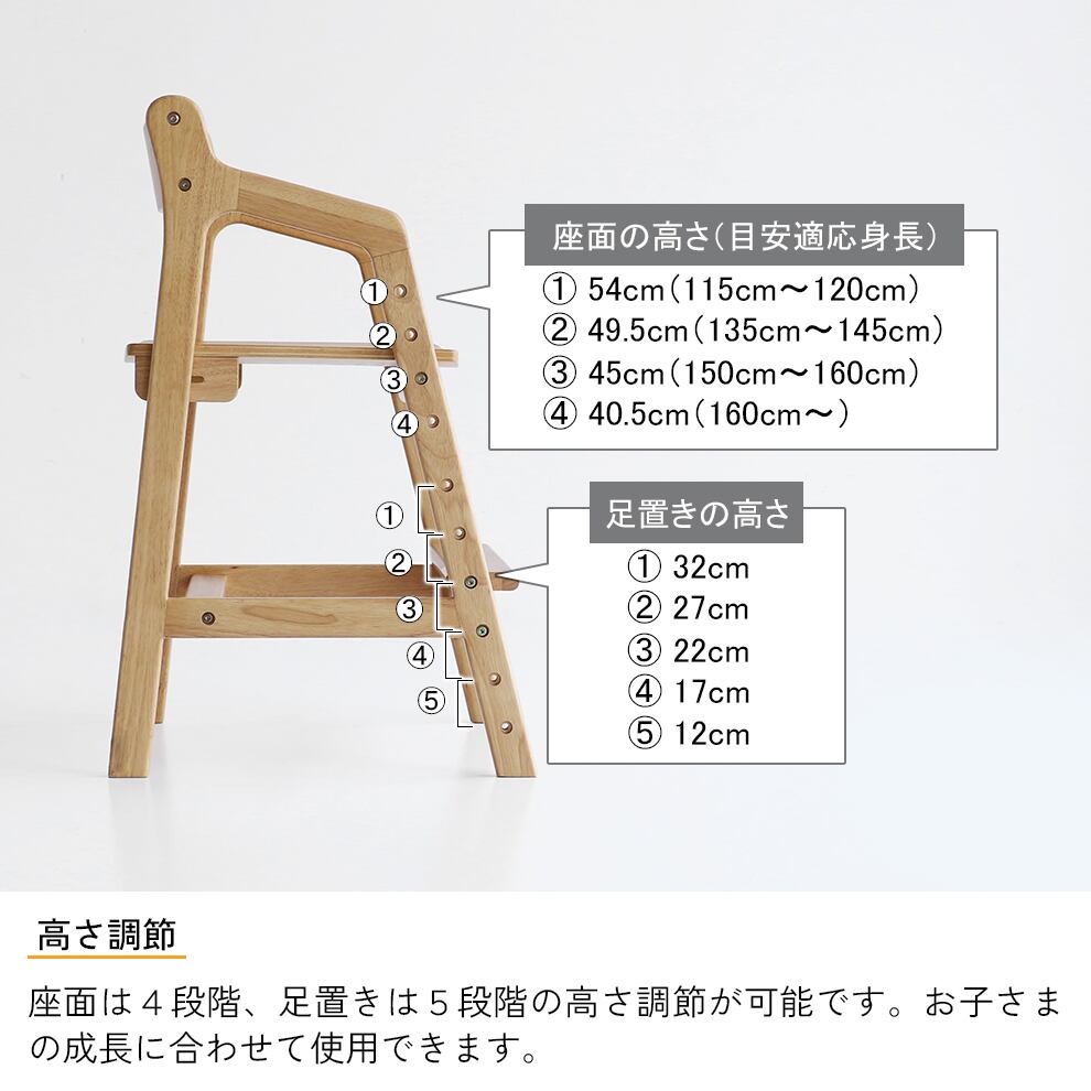 座面の高さ4段階、足置きの高さ5段階調整機能付きで、年齢や成長に応じて高さの調整が可能なロングライフデザインのキッズダイニングチェアです。