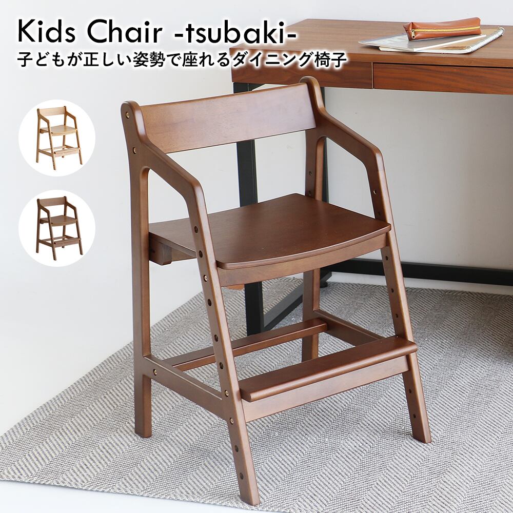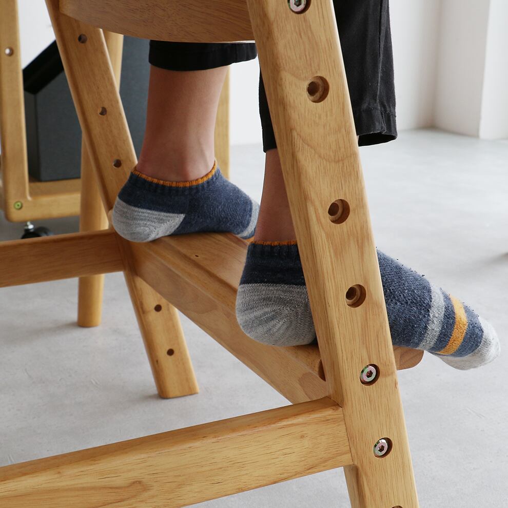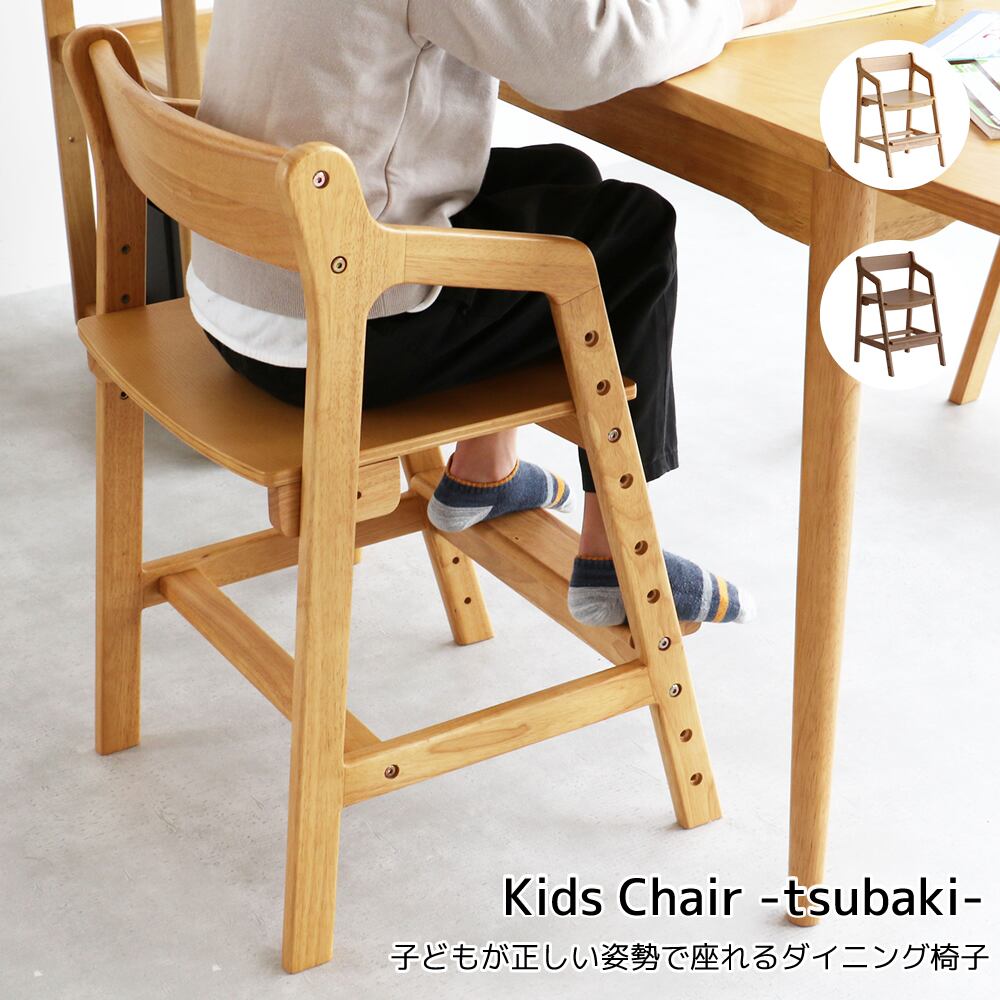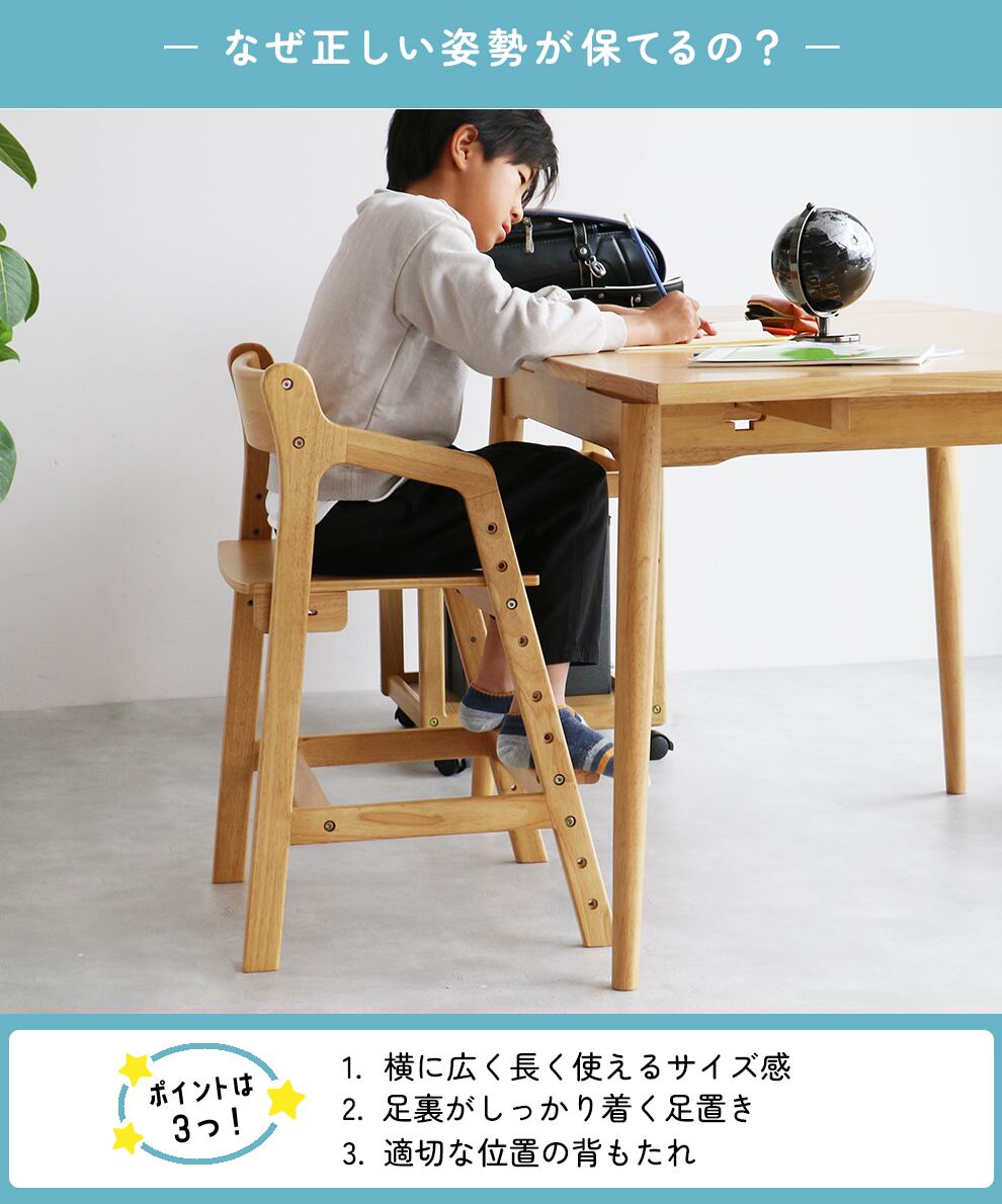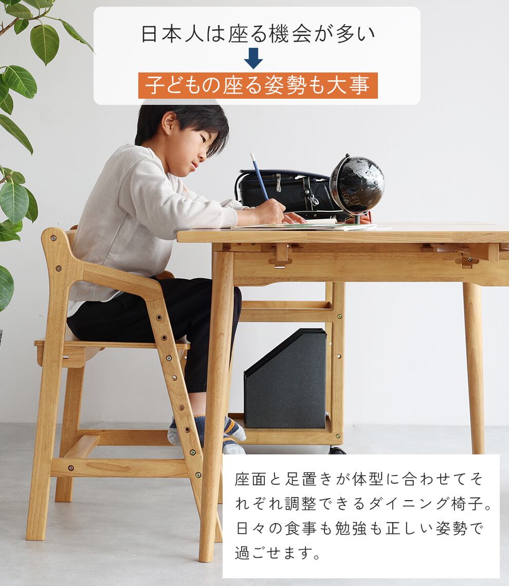 座面と足置きが体型に合わせてそれぞれ調整できるダイニングチェアは、日々の食事も勉強も正しい姿勢で過ごしやすい設計です。