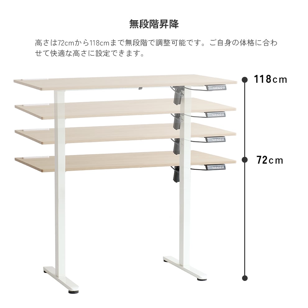 電動昇降デスク 120cm幅 ナチュラルホワイト 天板昇降デスク パソコンデスク コンセント付き USBポート付き ワークデスク 昇降デスク おすすめ おしゃれ モダン スタイリッシュ 電動昇降式机 作業デスク 作業机 作業台 幅120cm 奥行60cm 高さ72cm 最大高さ118cm 机 デスク