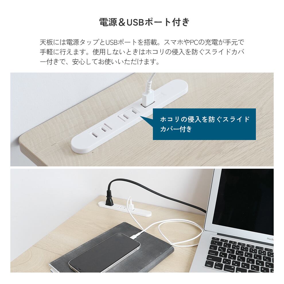 天板には電源タップとUSBポートを搭載しており、スマホやPCの充電を手元で簡単に行うことができ、使用しない時にはホコリの侵入を防ぐスライドカバー付きで安心してご使用いただけます。