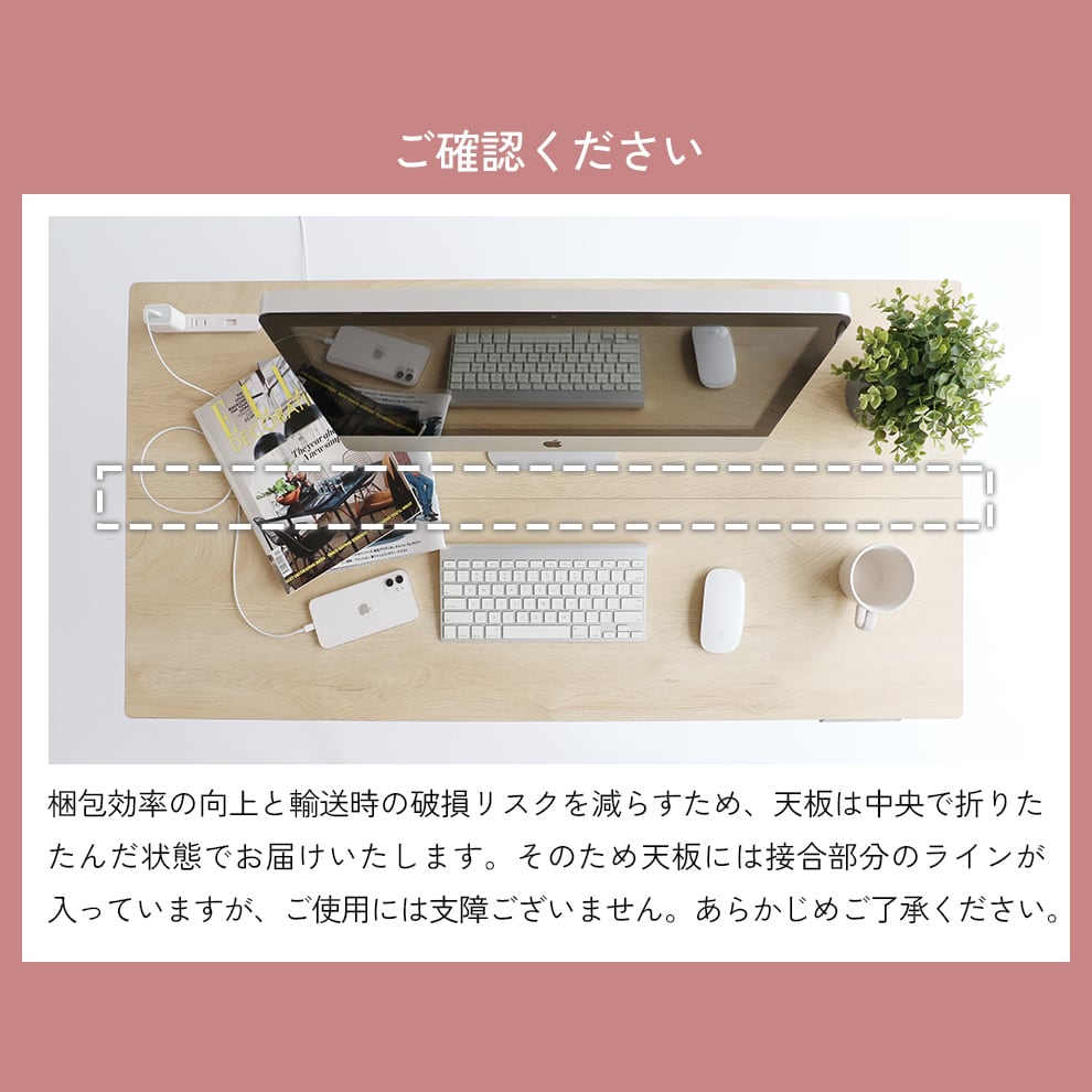 ・梱包効率の向上と輸送時の破損リスクを減らすため、天板は中央で折りたたんだ状態でお届け致します。そのため天板には接合部分のラインが入っていますが、ご使用には支障ございませんので予めご了承ください。(※画像でも必ずご確認をお願い致します。)