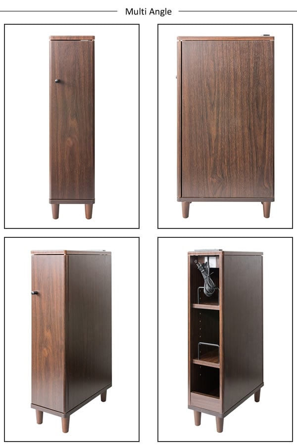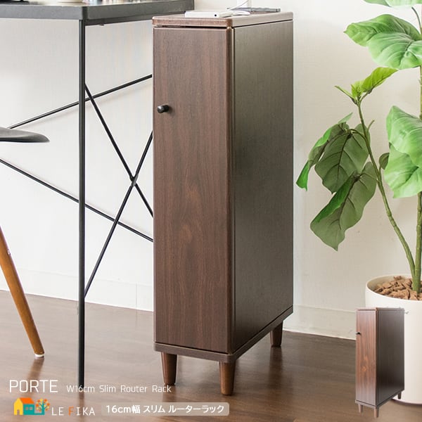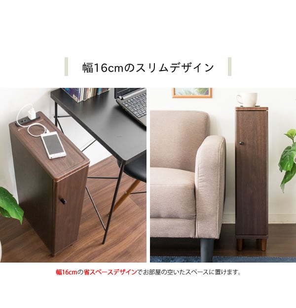 シンプルなブラウンの木目柄で家具や壁との隙間に置ける幅16cmのスリムなデザインです。