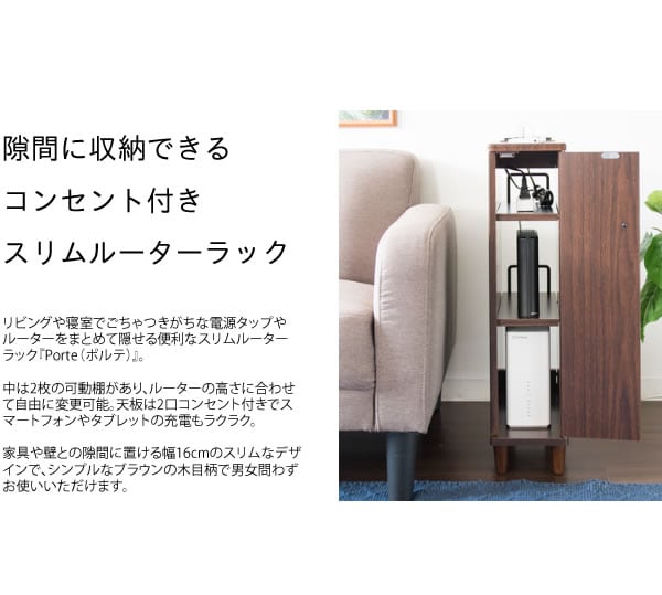 ルーターラック 16cm幅 ブラウン 茶色 収納ラック ルーター収納 隙間収納 おすすめ おしゃれ 北欧 モダン 収納ラック 収納棚 コンパクトラック 省スペース コンセント付き 幅16cm 奥行き35cm 高さ70cm 可動棚 スリムラック スリム収納 2口コンセント 春 夏秋 冬 棚 収納