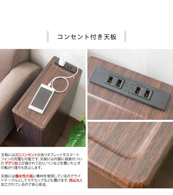 天板は2口コンセント付きでスマートフォンやタブレットの充電も可能です。