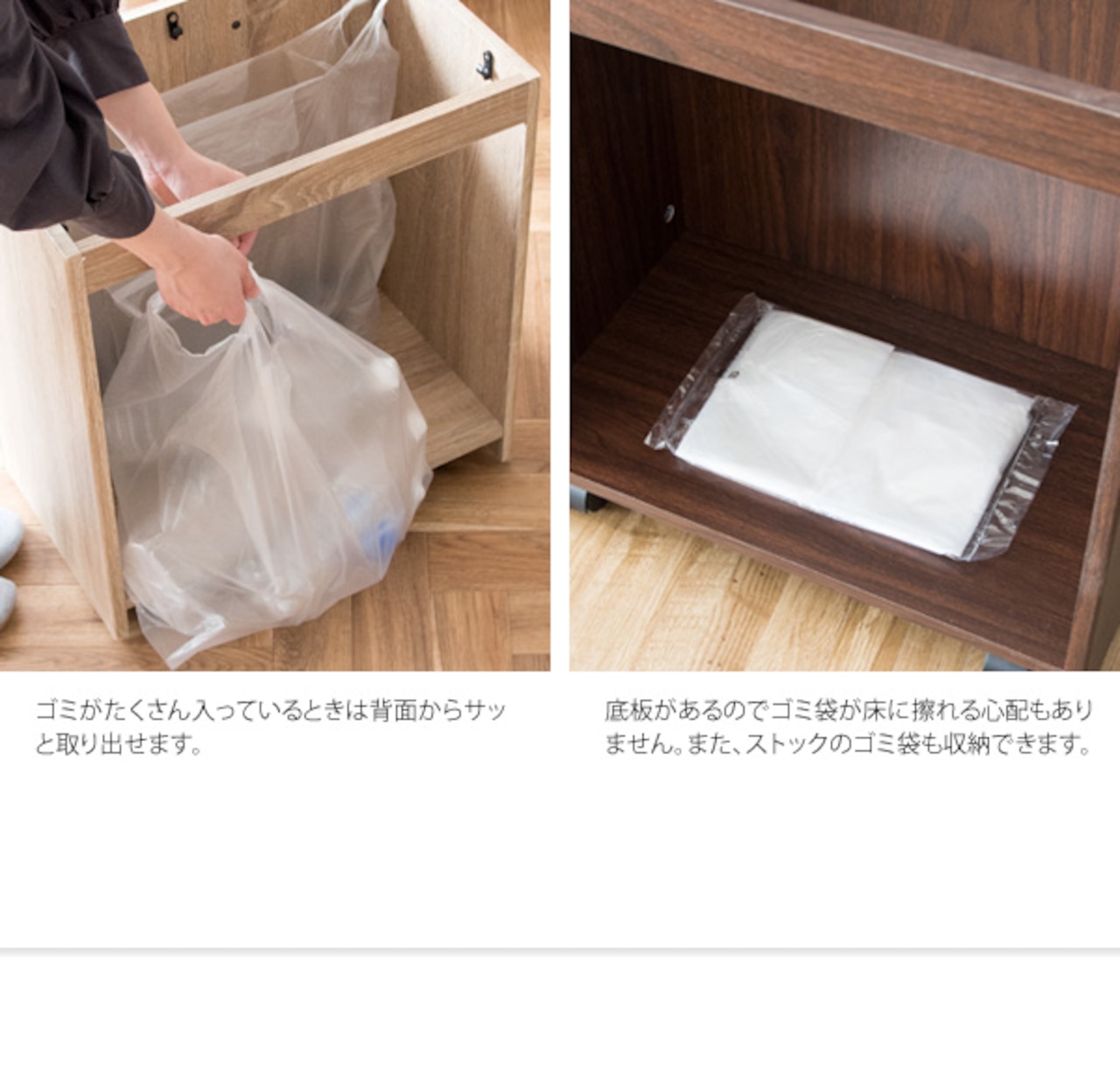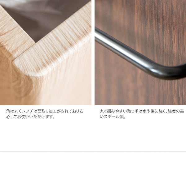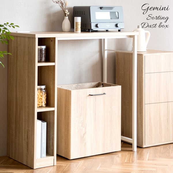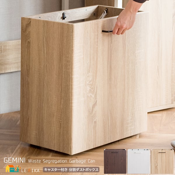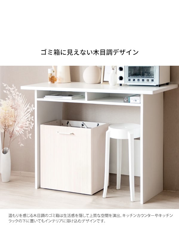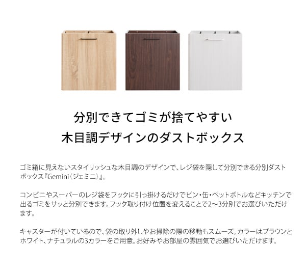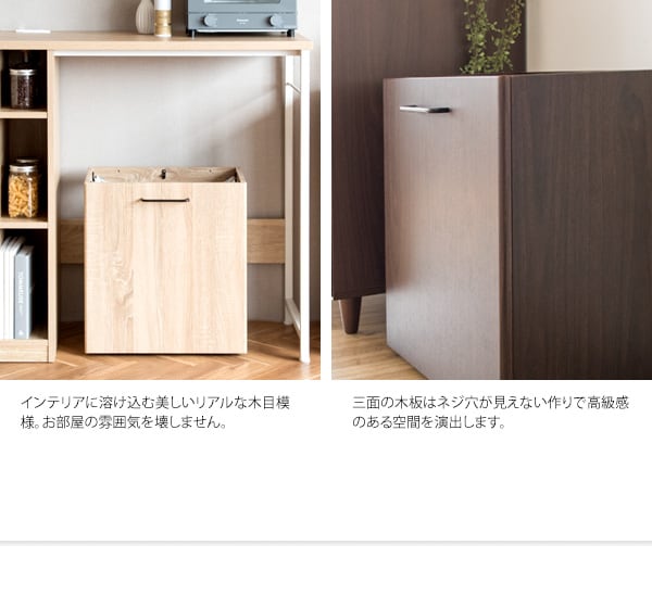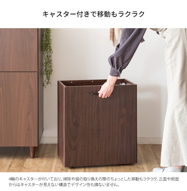 ゴミ箱に見えないスタイリッシュな木目調のデザインで、レジ袋を隠して分別できる分別ダストボックスです。