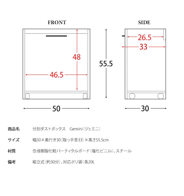 ■商品サイズ(約):幅50cm、奥行き30cm(取っ手を含む奥行33cm)、高さ55.5cm