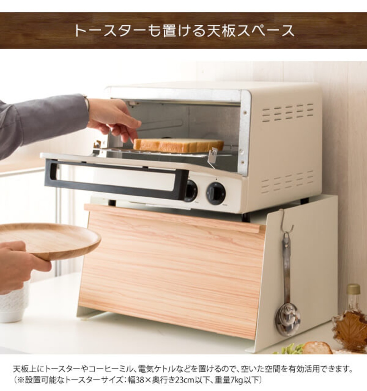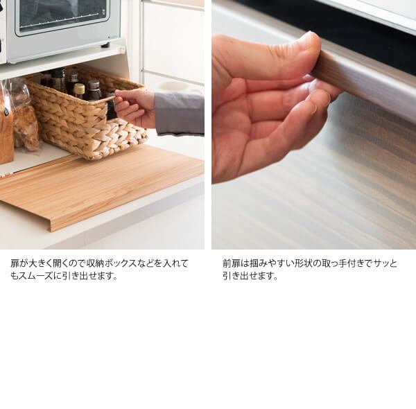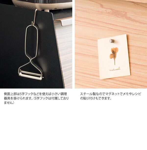 天板にはオーブントースターやコーヒーメーカーも置けるのでキッチン周りがスッキリ片付きます。