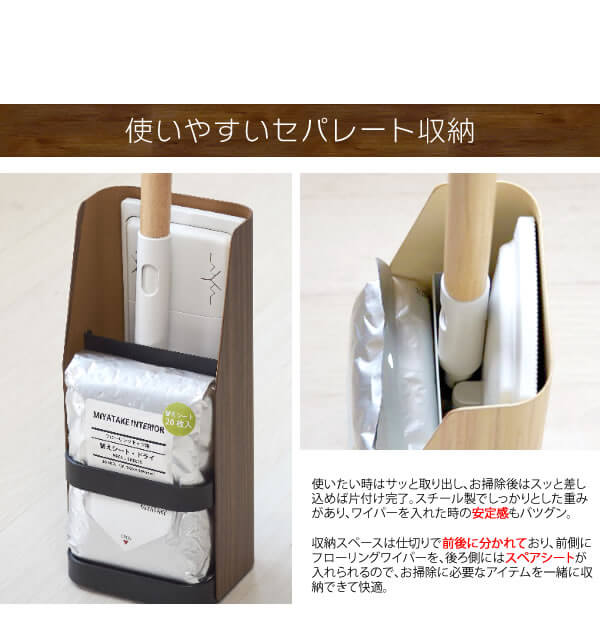 フローリングワイパーはもちろんスペアシートが入れられる収納スペースもあるので、必要なアイテムを一緒に収納できて利便性も良いフローリングワイパースタンドです。