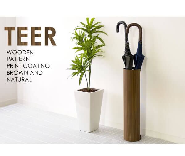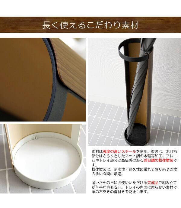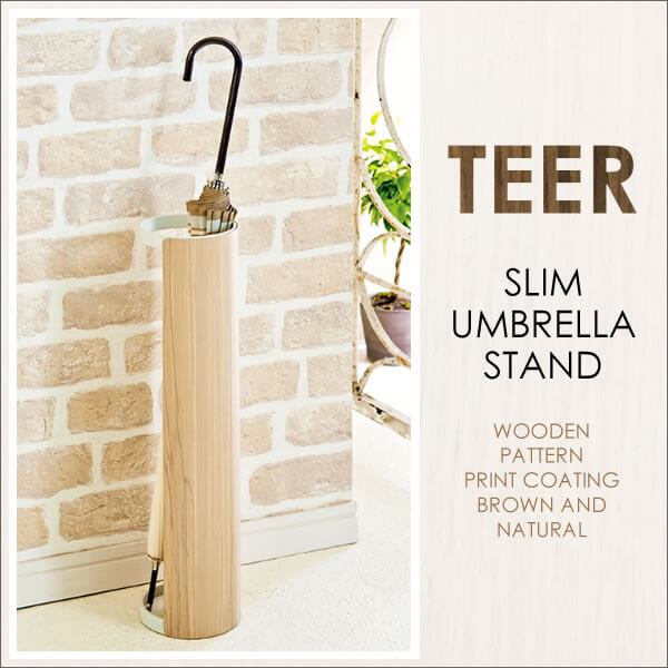 上品で繊細な木目柄が転写されたスチールデザインのスリムなラウンド型のアンブレラスタンドです。