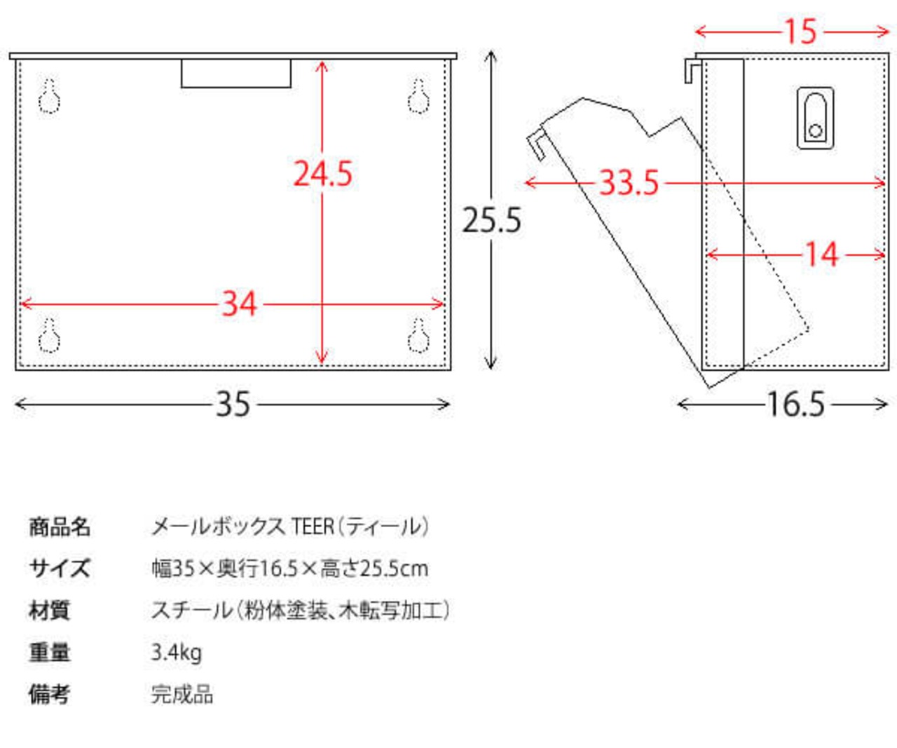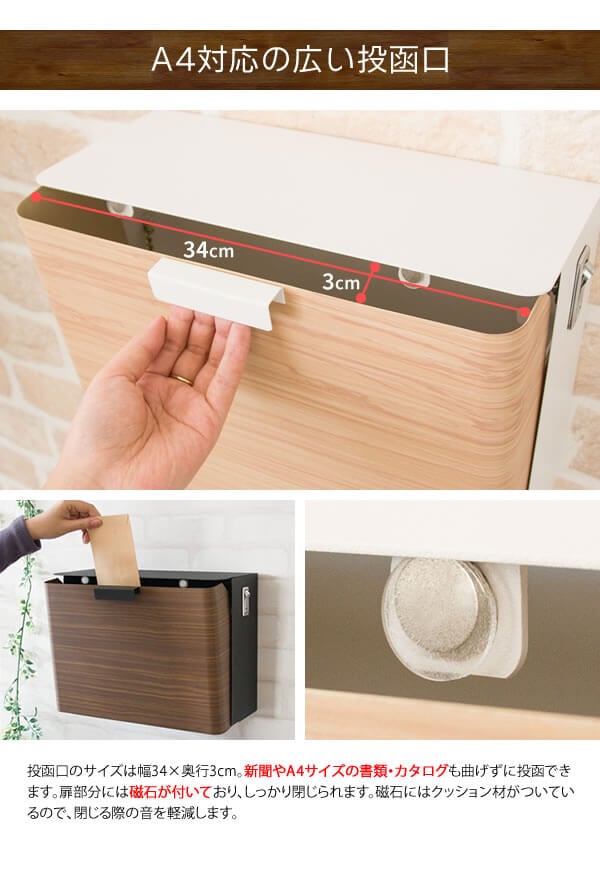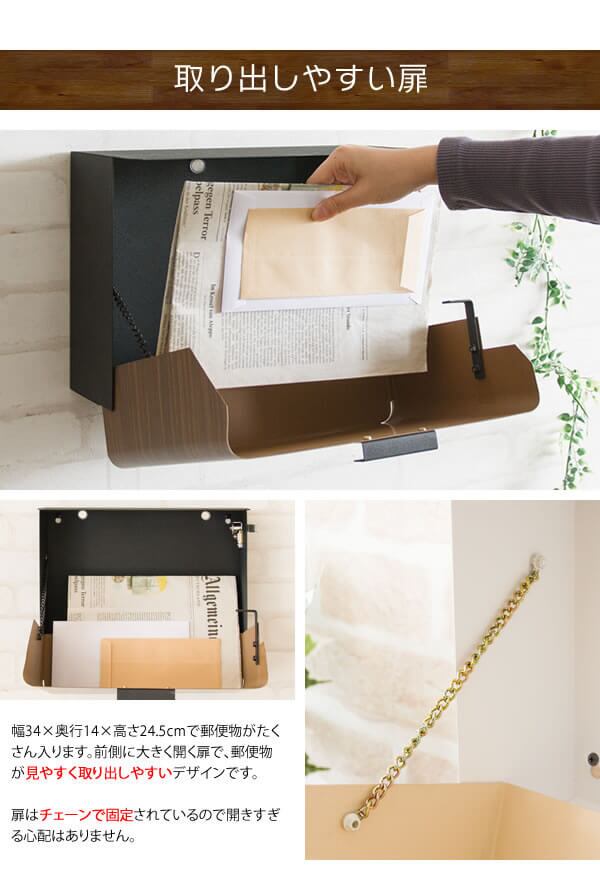 壁掛け式郵便受け 35cm幅 ナチュラル ブラウン 郵便ポスト メールボックス おすすめ おしゃれ 北欧調 モダン スタイリッシュ スチール製 木目調 新聞受け 鍵付き郵便受け 鍵付きポスト 手前開き 幅35cm 奥行16.5cm 高さ25.5cm 施錠付き郵便受け 壁付け式 新聞受け 壁面設置