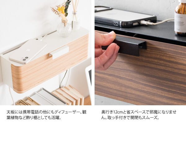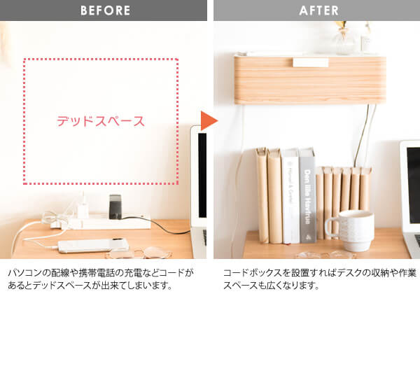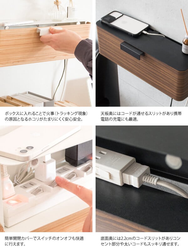 壁付けすることでデッドスペースを有効活用でき、6口コンセントなどがスッポリ入る大きさで、デスク周りのパソコンの配線や、テレビや録画機器の後ろの配線、充電器タップなどをまとめて収納できます。