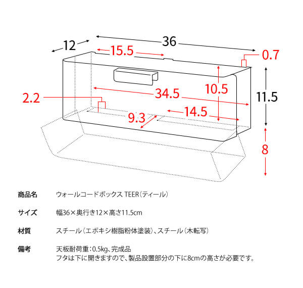 ・フタは下に開きますので、製品設置部分の下に約8cm程度の高さが必要です。