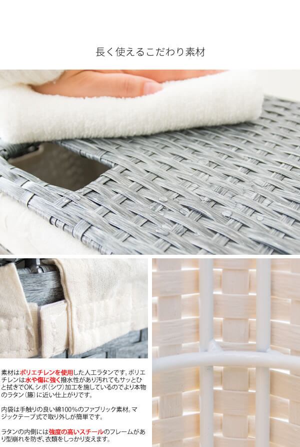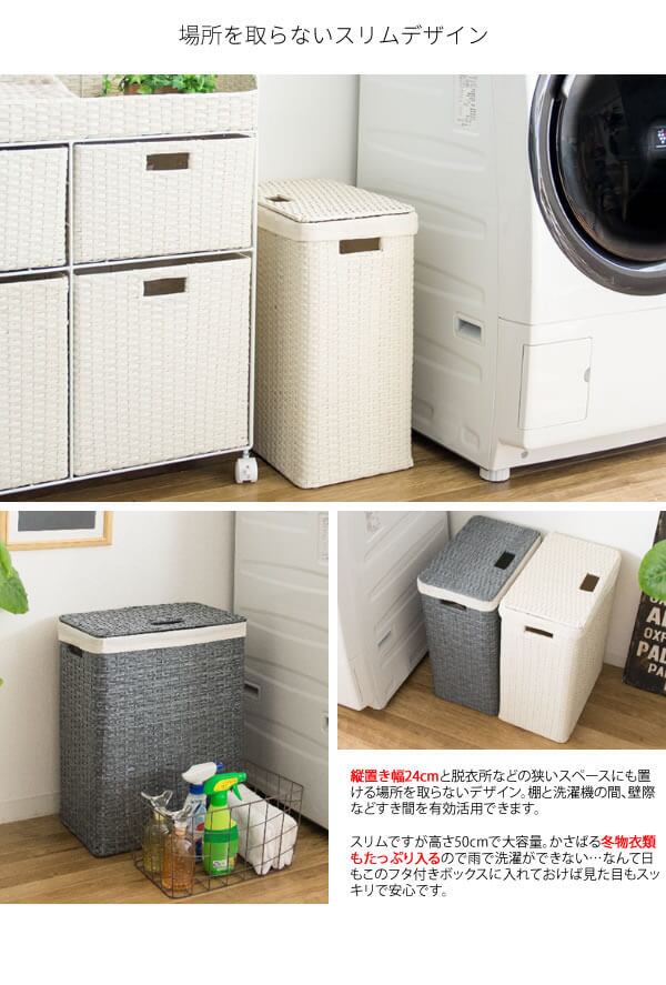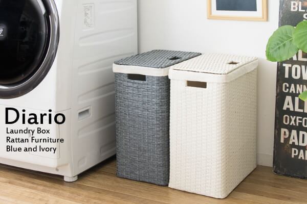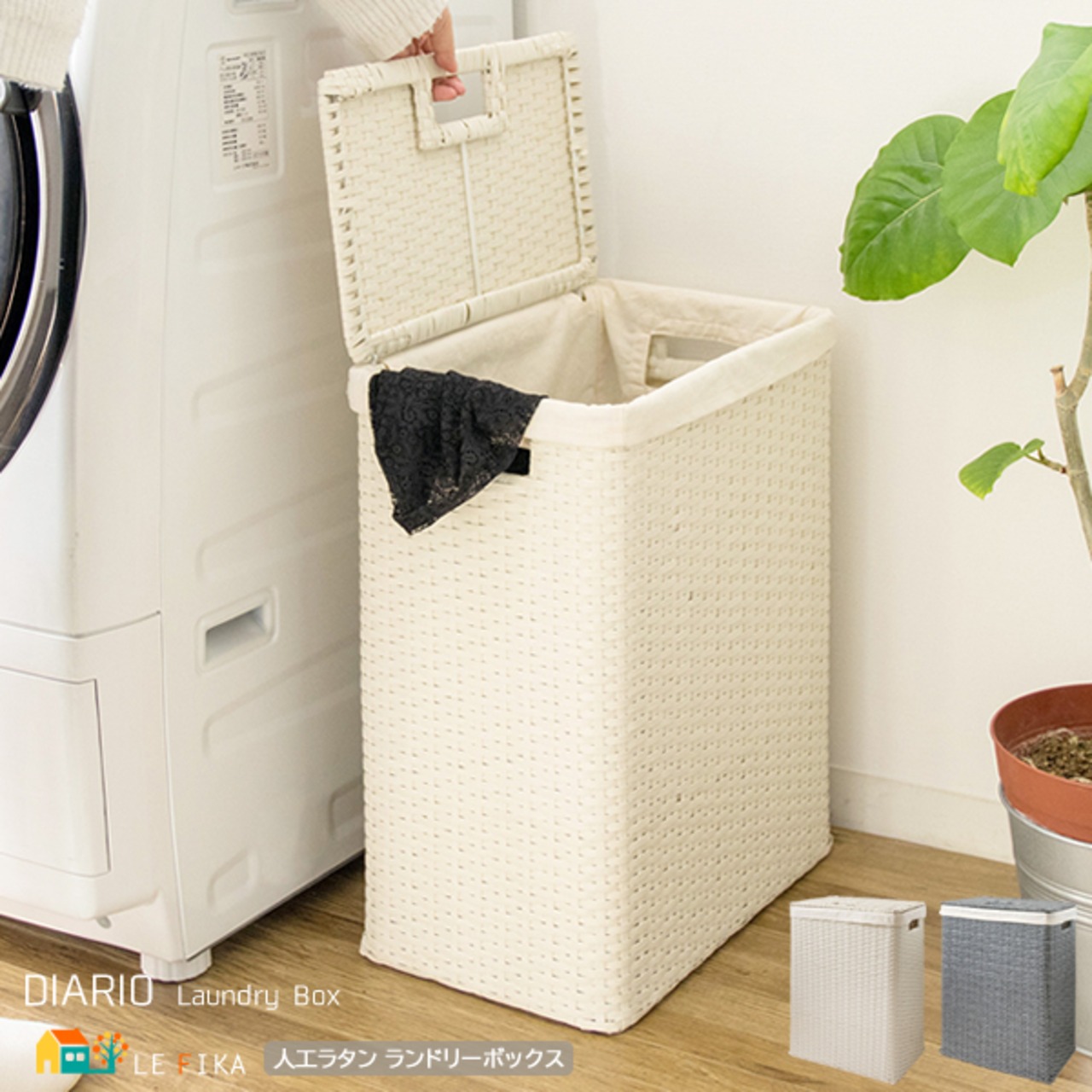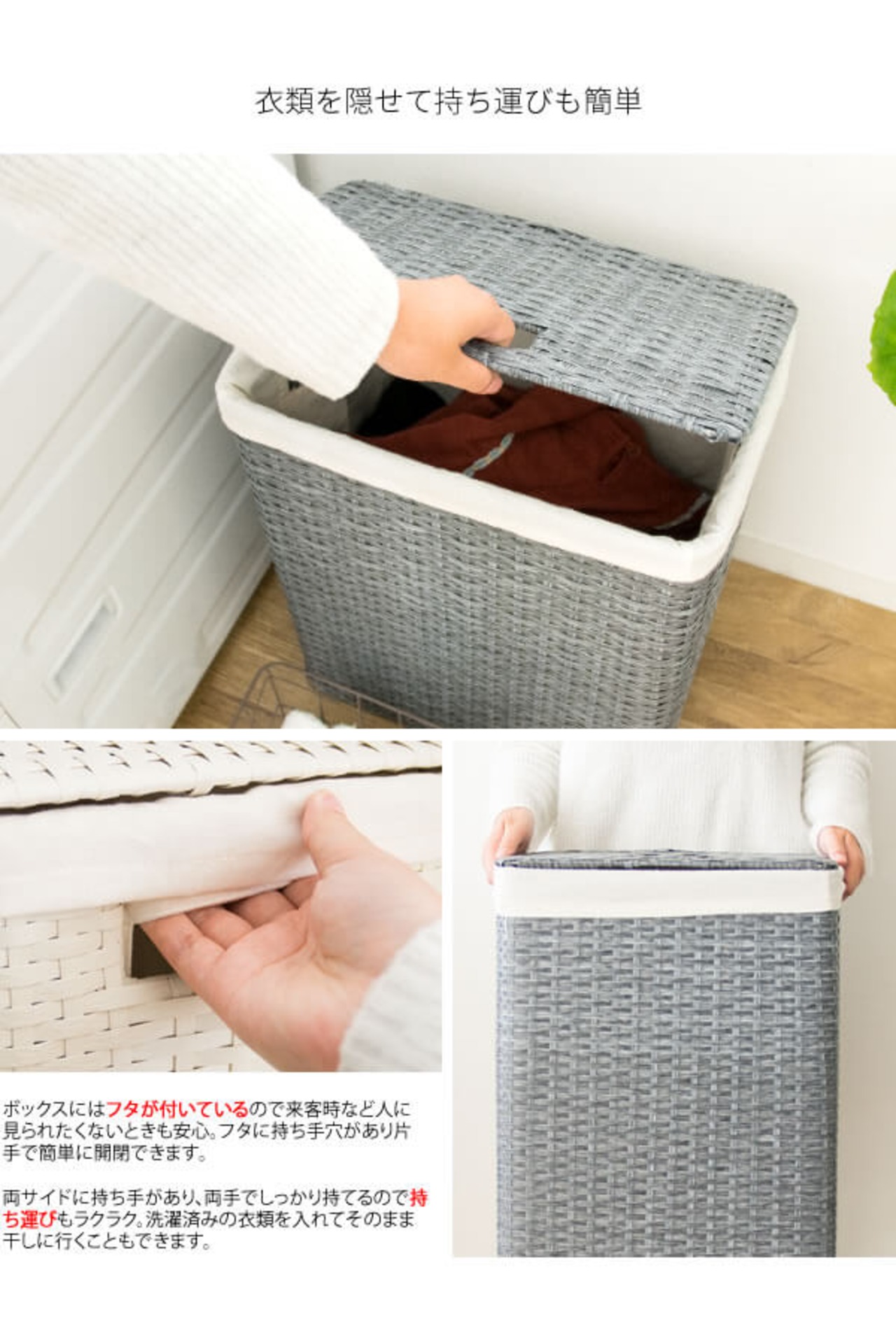 中の衣類を隠せるフタ付きで、省スペースで軽量な人工ラタンを使用したランドリーボックスです。