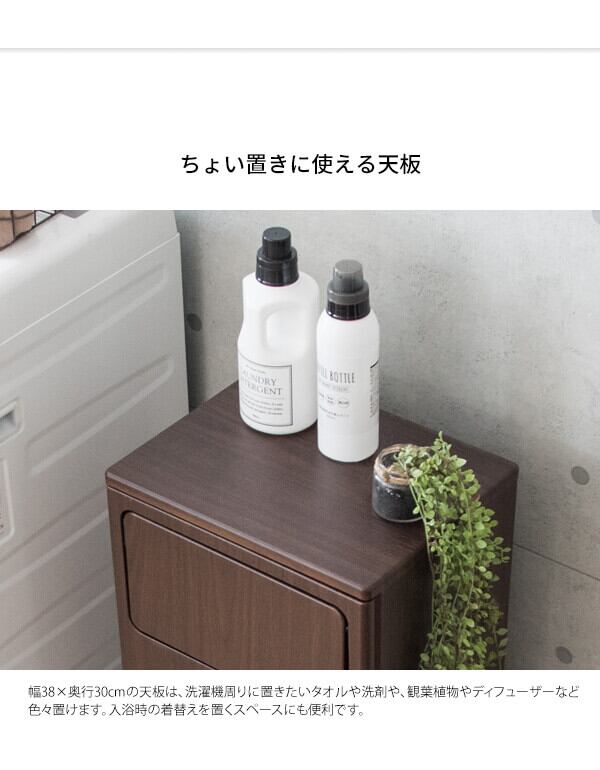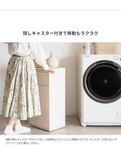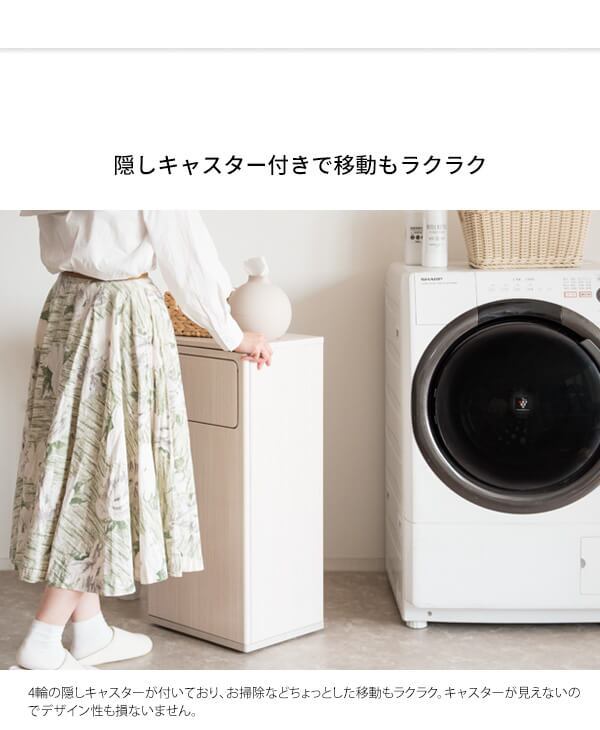 天板にはランドリー周りに置きたい洗剤やタオルも置くことができ、隠しキャスターが付いているのでお掃除や移動もスムーズです。
