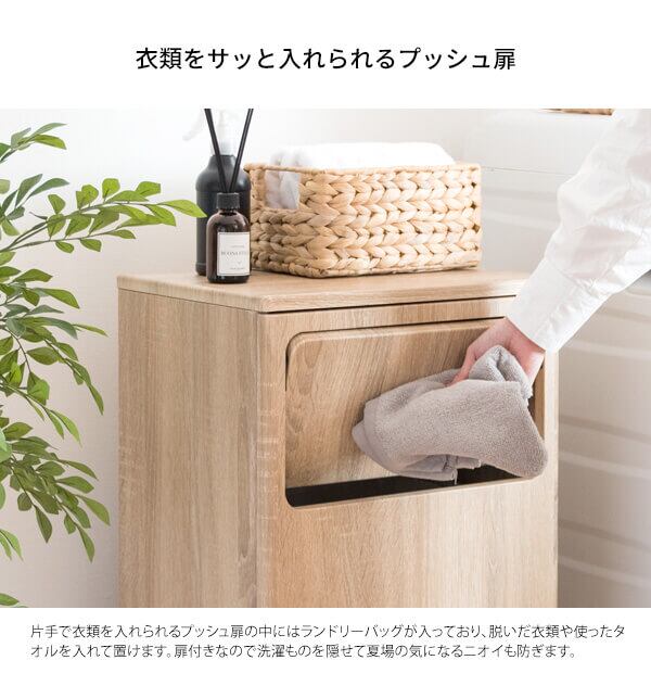 プッシュ扉から片手で衣類を入れられるボックスは、中のランドリーバッグに衣類がたっぷり入るのでご家族でお使いいただけます。
