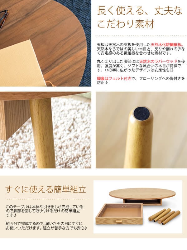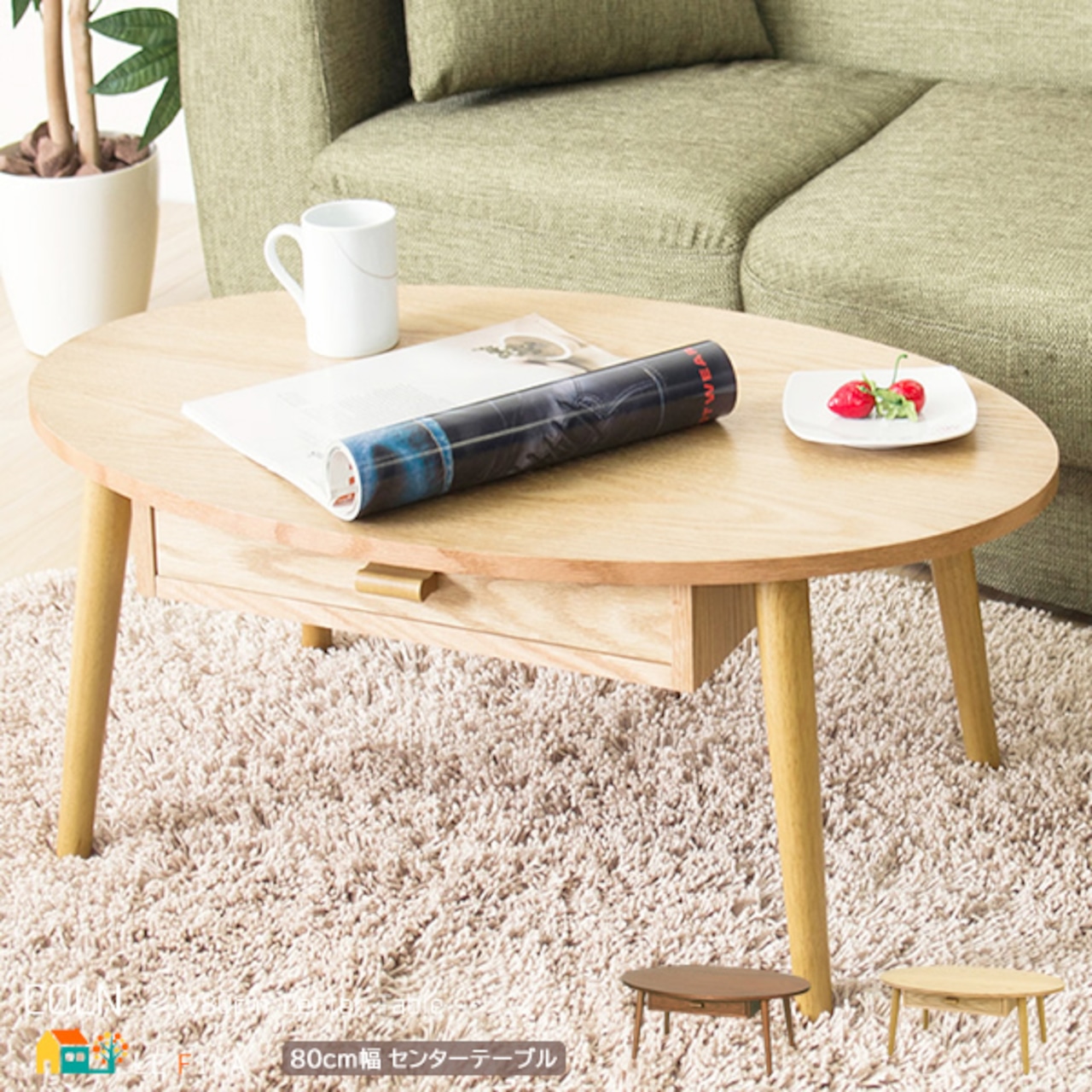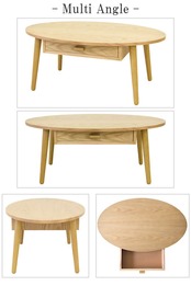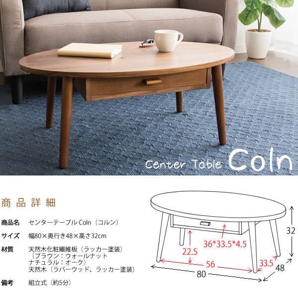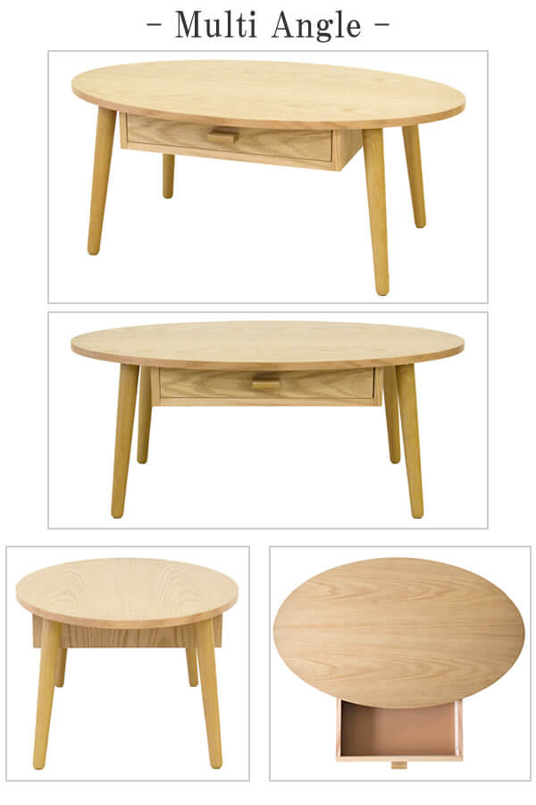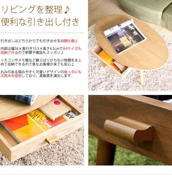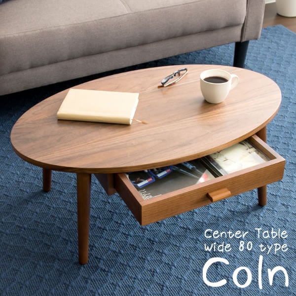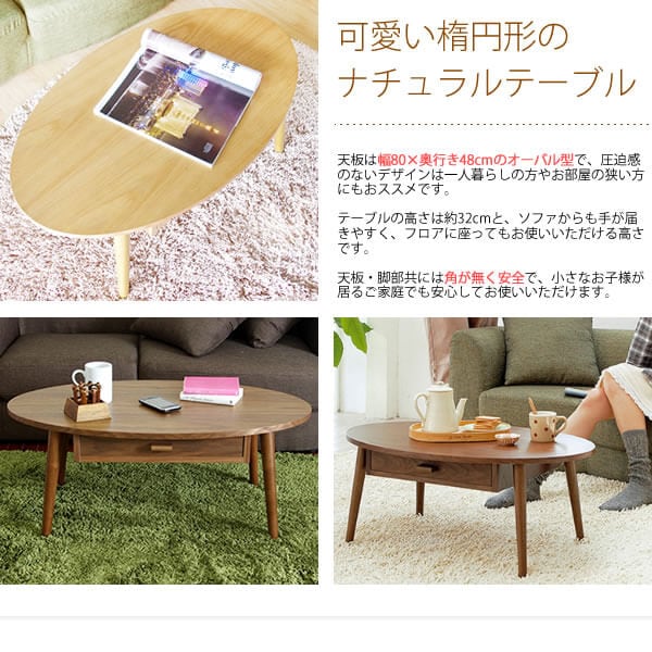木目が美しい天然木の突板を使用した天板と、両サイドから取り出せる引き出しが付いた80cm幅のオーバル型木製センターテーブルです。