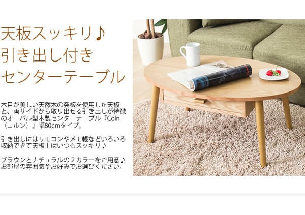 センターテーブル 80cm幅 ブラウン ナチュラル 茶色 引き出し収納付きテーブル オーバルテーブル ウッドテーブル 幅80cm 奥行48cm 高さ32cm リビングテーブル おすすめ おしゃれ 北欧 モダン スタイリッシュ 作業机 作業台 ローテーブル 収納付きテーブル 机 春 夏 秋 冬