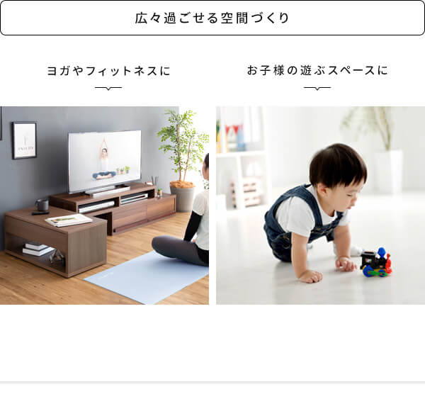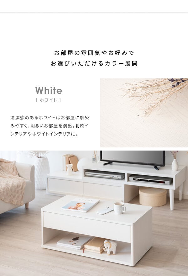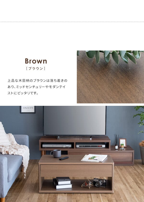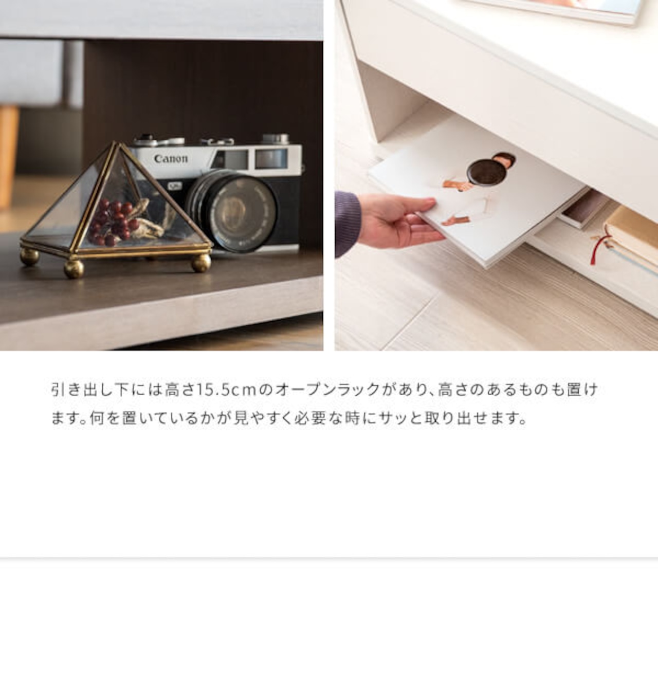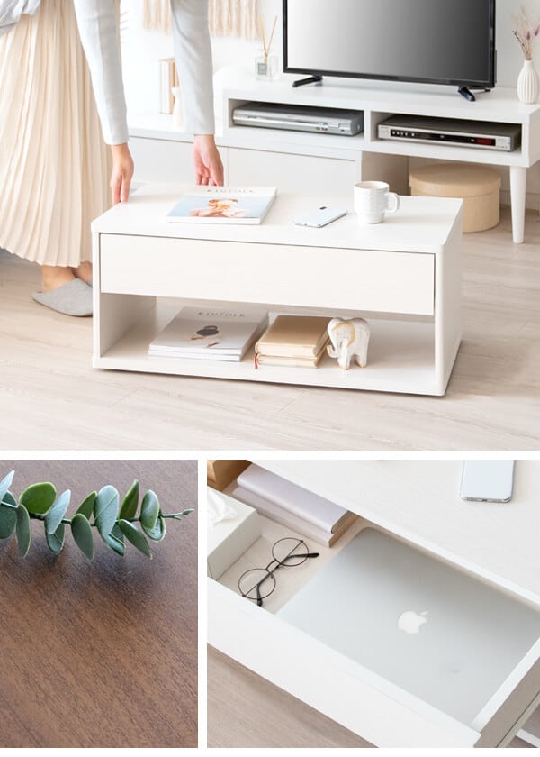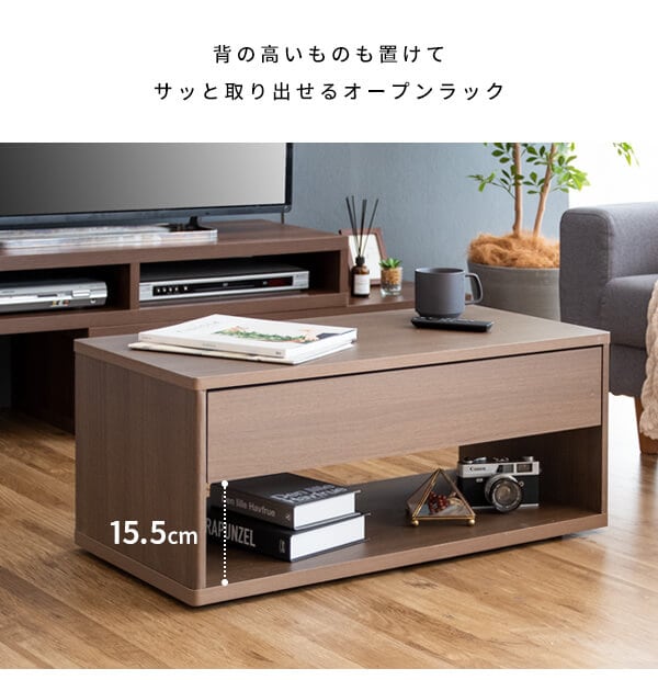 リモコンや新聞など雑貨を隠して収納できる引き出しと、サッと取り出せるオープンラック付きでリビング周りもすっきりします。