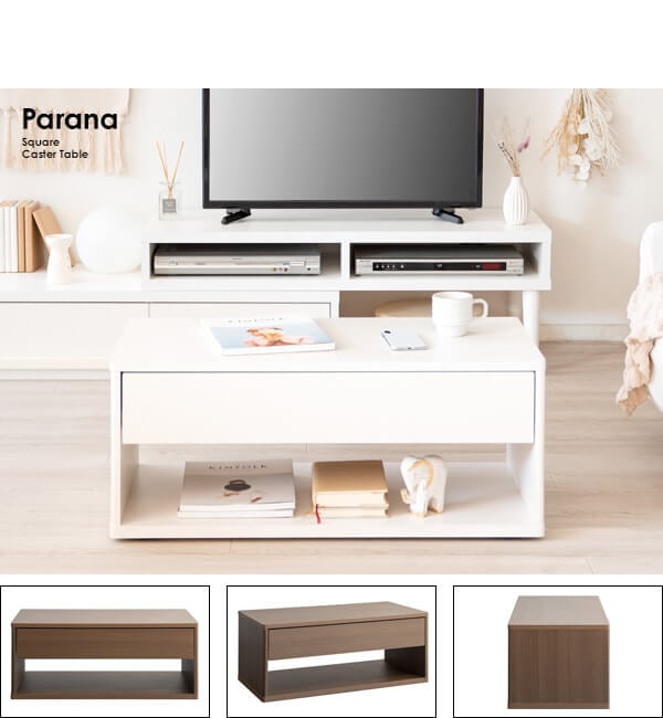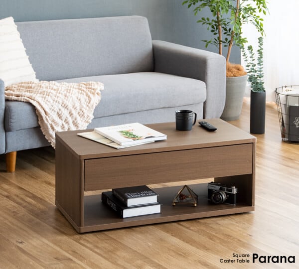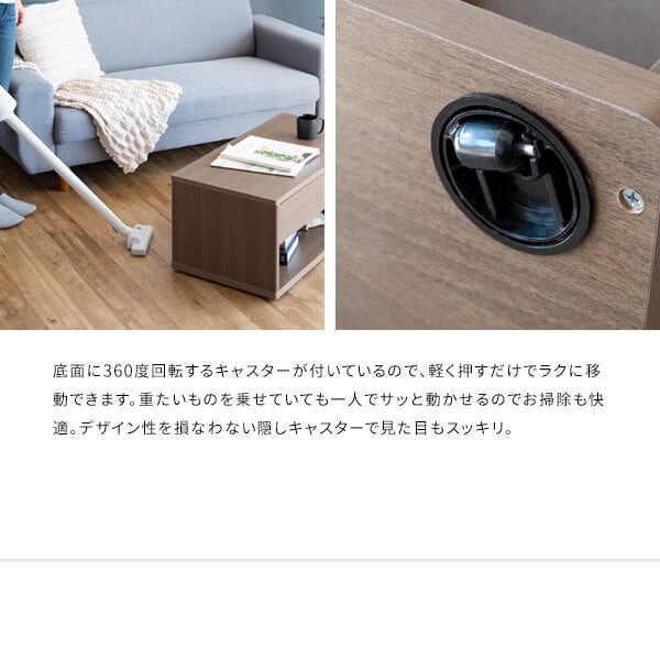 隠しキャスターでラクに移動できる、便利な80cm幅のスクエアタイプのキャスター付きのセンターテーブルです。