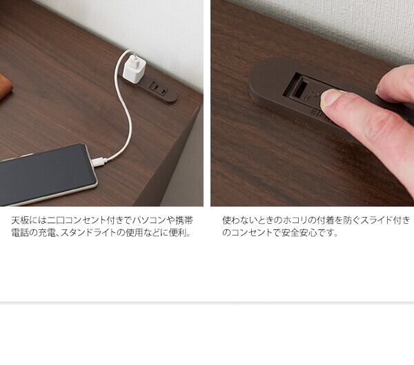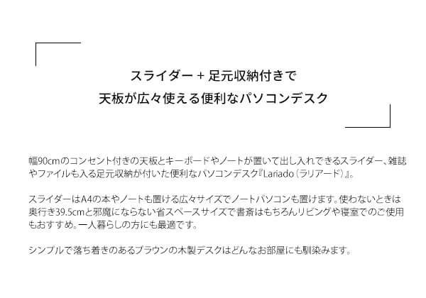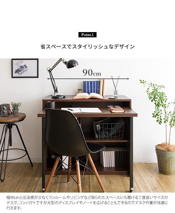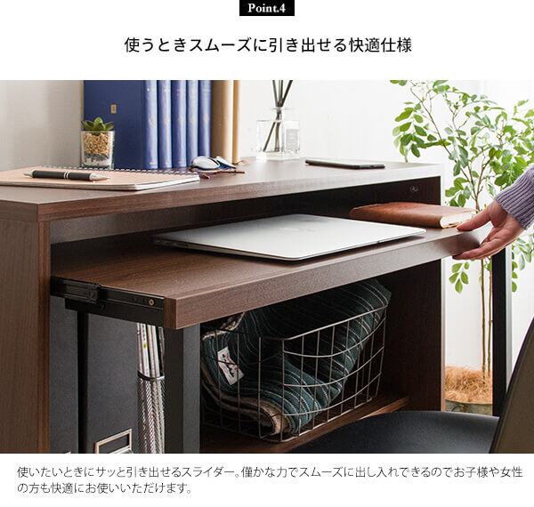 幅90cmのコンセント付きの天板とキーボードやノートが置いて出し入れできるスライダー、雑誌やファイルも入る足元収納が付いた便利なパソコンデスクです。