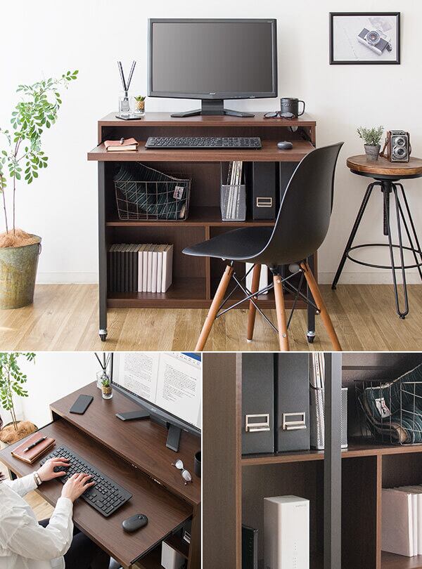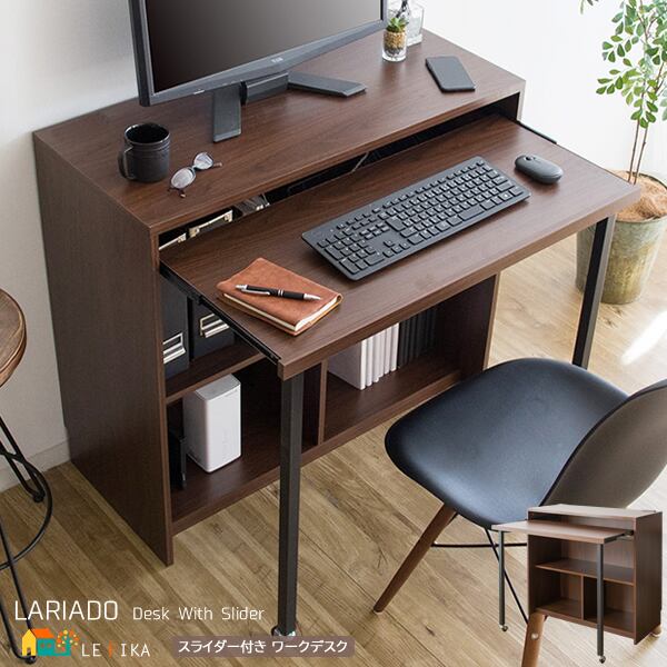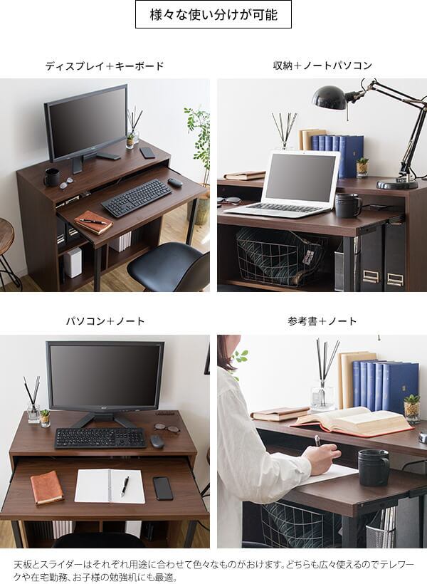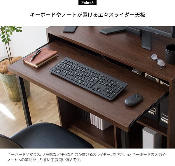 スライダー付きデスク パソコンデスク 机 作業台 作業机 作業デスク コンセント付きデスク 収納付きデスク おすすめ おしゃれ 北欧 ブラウン 書斎デスク オープン収納 キーボード台付きデスク スライダーデスク PCデスク