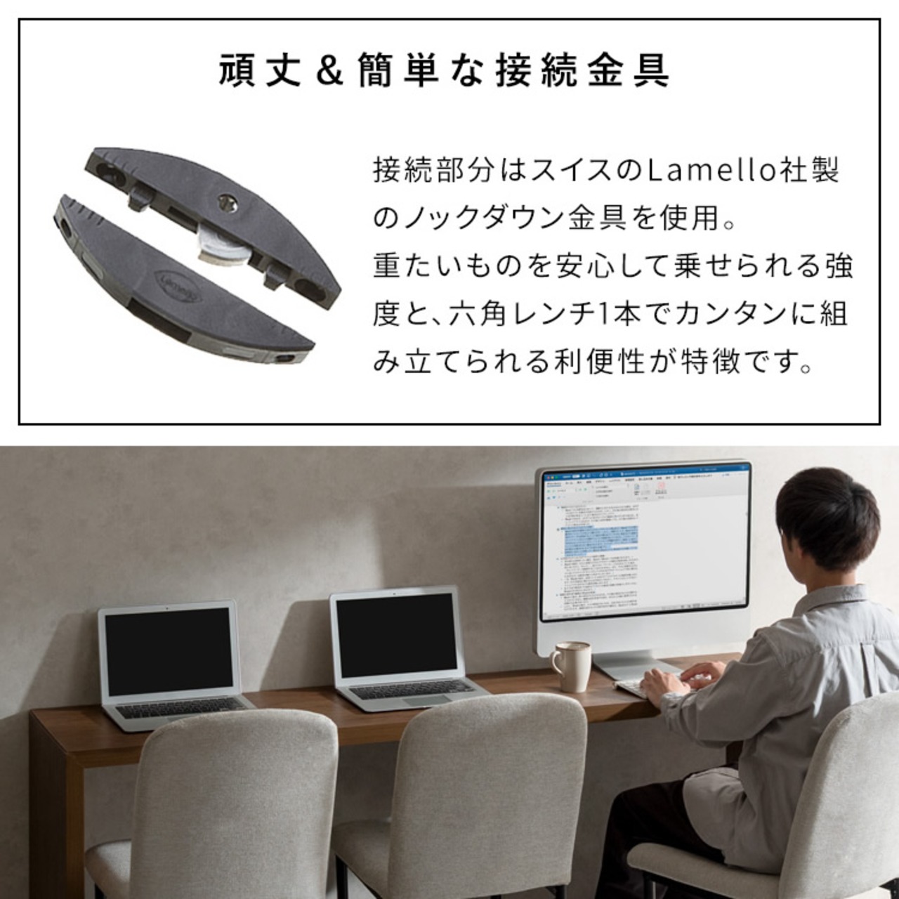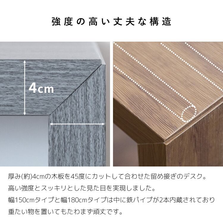 厚み4cmの木板を45度にカットして合わせた留め接ぎのデスクは、高い強度とスッキリとした見た目を実現し、パソコンやプリンターも置けるので、テレワークや在宅勤務の方にも安心してお使いいただけます。