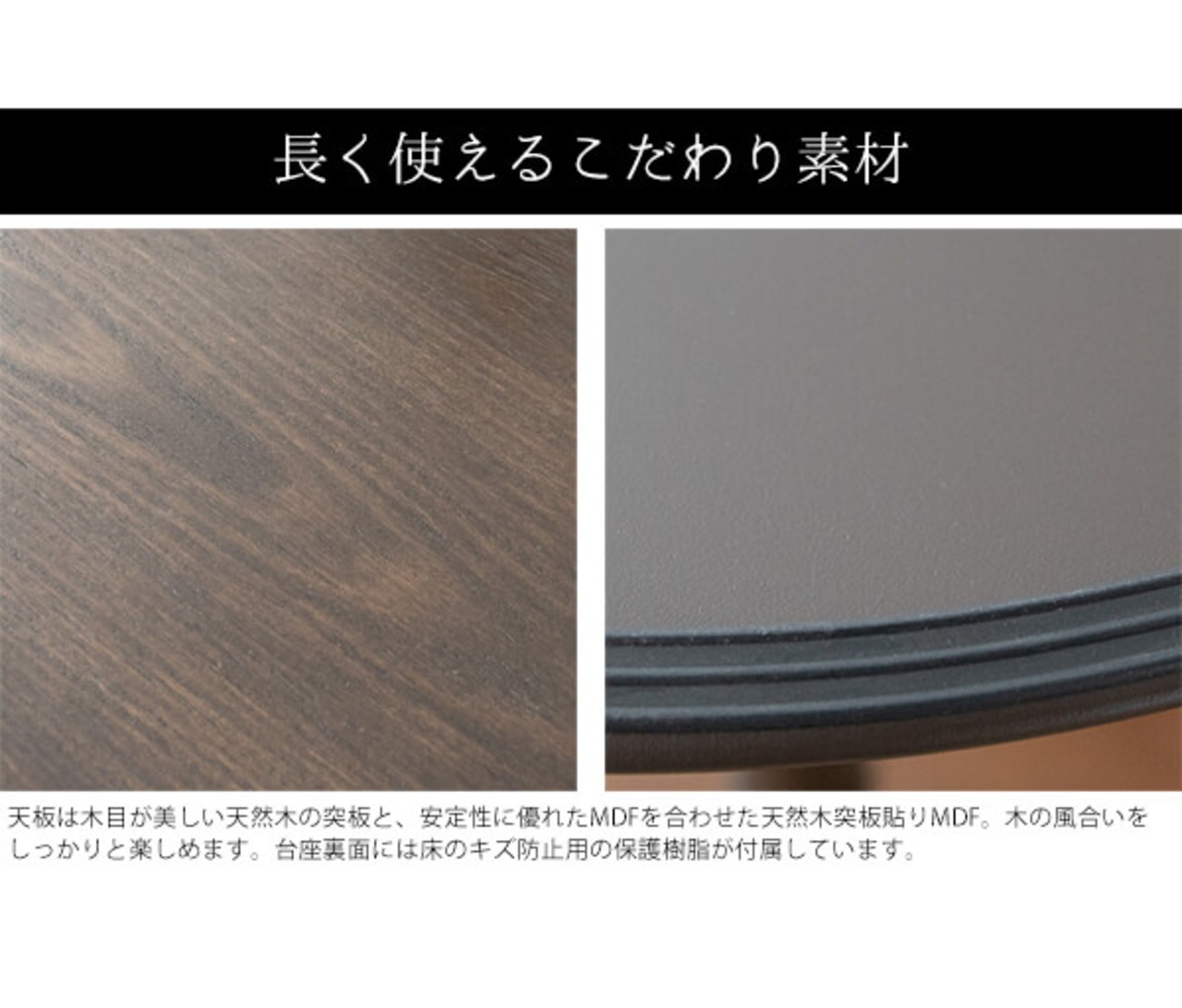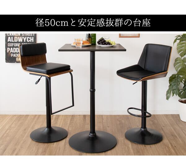 ダークブラウンの木目が美しい天板で、台座は通常よりも大きめな径50cmと安定感も抜群です。
