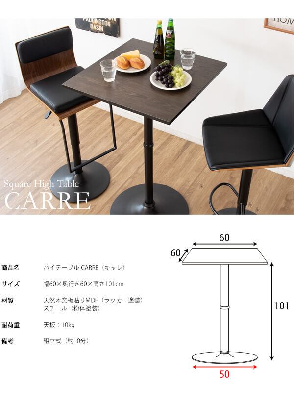幅60cmの広々とした天板に、高さ101cmで、バーチェアはもちろんスタンディングテーブルとしても使いやすいスクエア型ハイテーブルです。