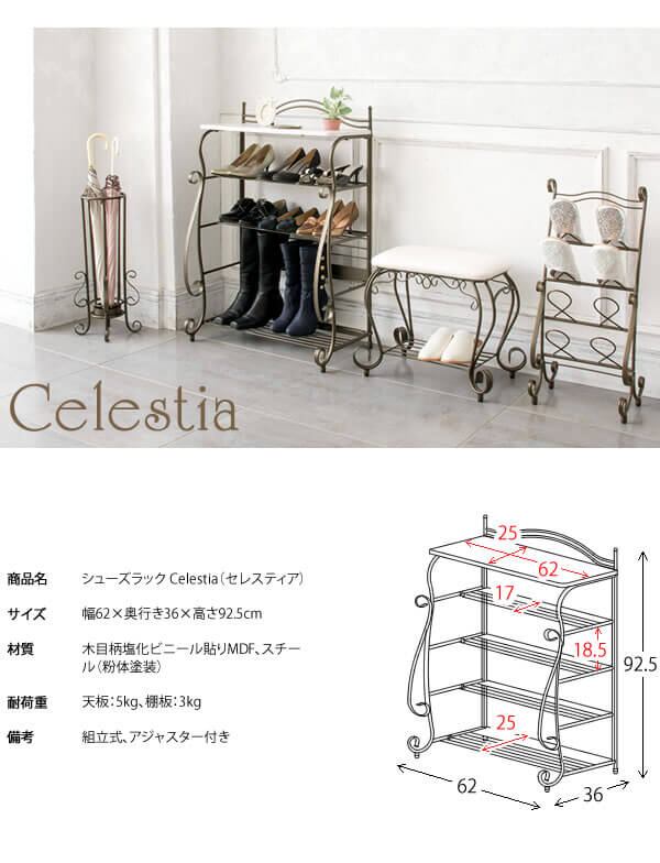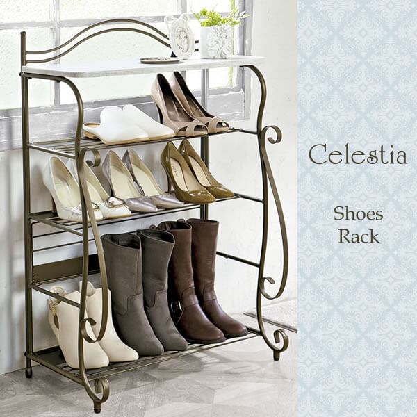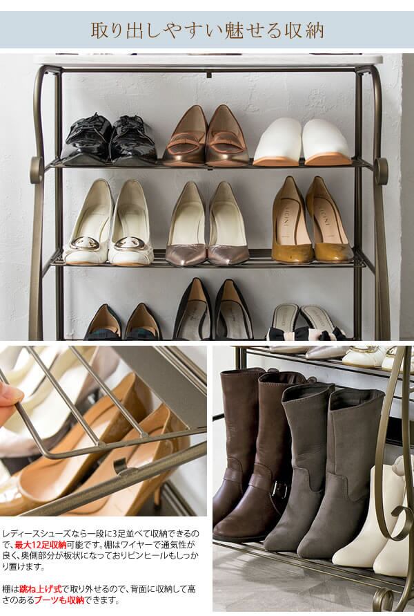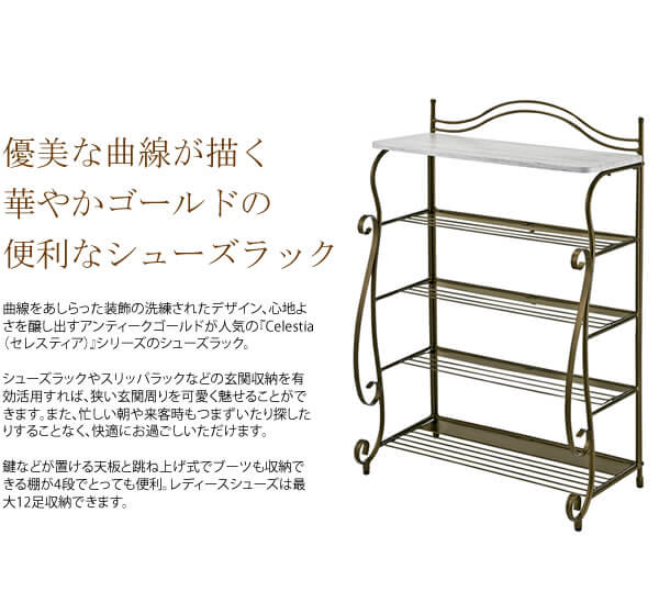 曲線をあしらった装飾の洗練されたデザインとアンティークゴールドのフレームがおしゃれなシューズラックです。