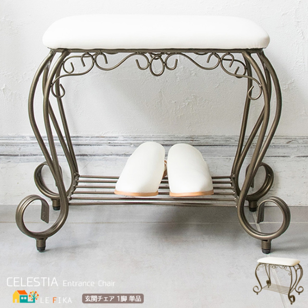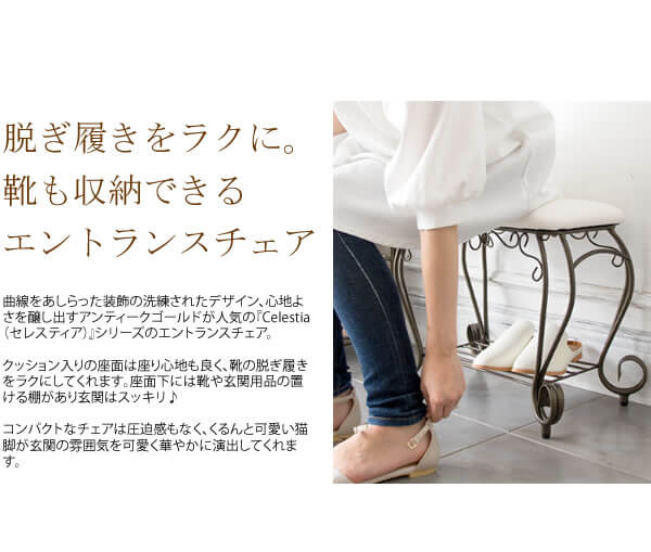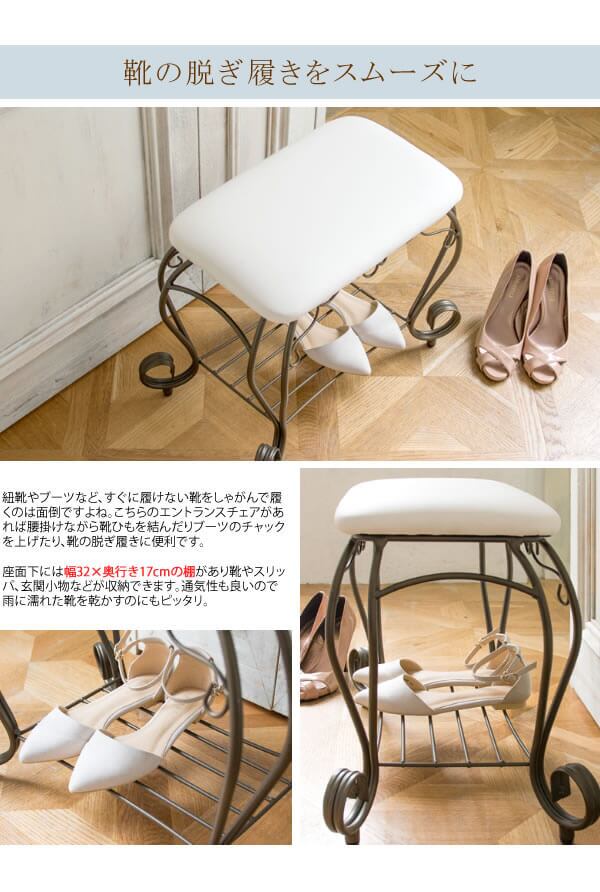 クッション入りの座面は座り心地も良く、座面下には靴や玄関用品の置ける棚がある玄関チェアです。