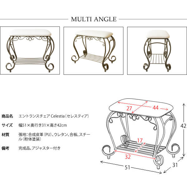 玄関スツール 51cm幅 ゴールド エントランスチェア 玄関チェア エントランススツール 背もたれ無し 肘置き無し 収納棚付き 幅51cm 奥行31cm 高さ42cm おすすめ おしゃれ 北欧 モダン スタイリッシュ アンティーク調 合皮スツール 合成皮革 合皮チェア 椅子 玄関椅子 チェアー