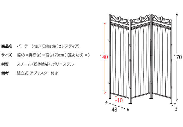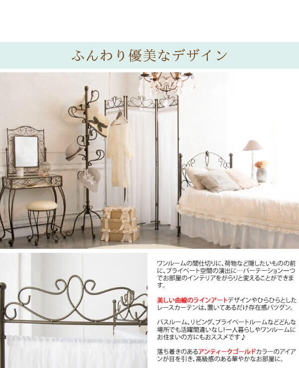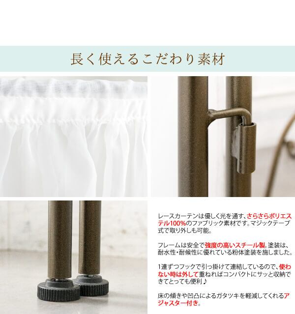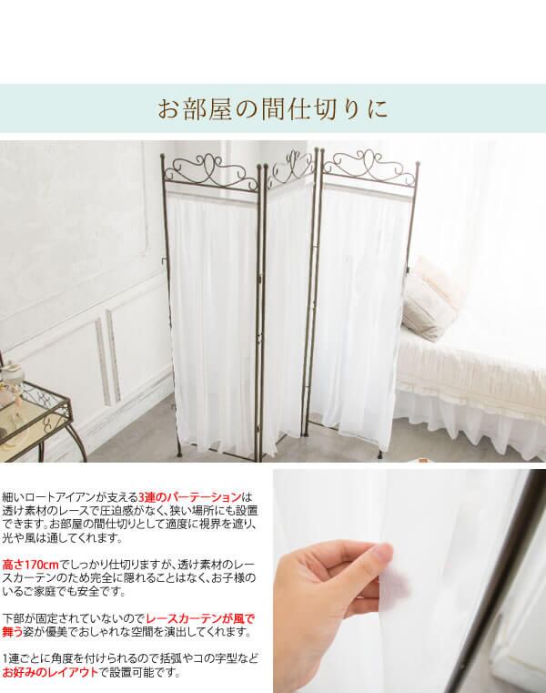 優美なフレームデザインと軽やかになびくレースカーテンがおしゃれな、ワンルームの間仕切りや、隠したい物の前への設置におすすめのパーテーションです。