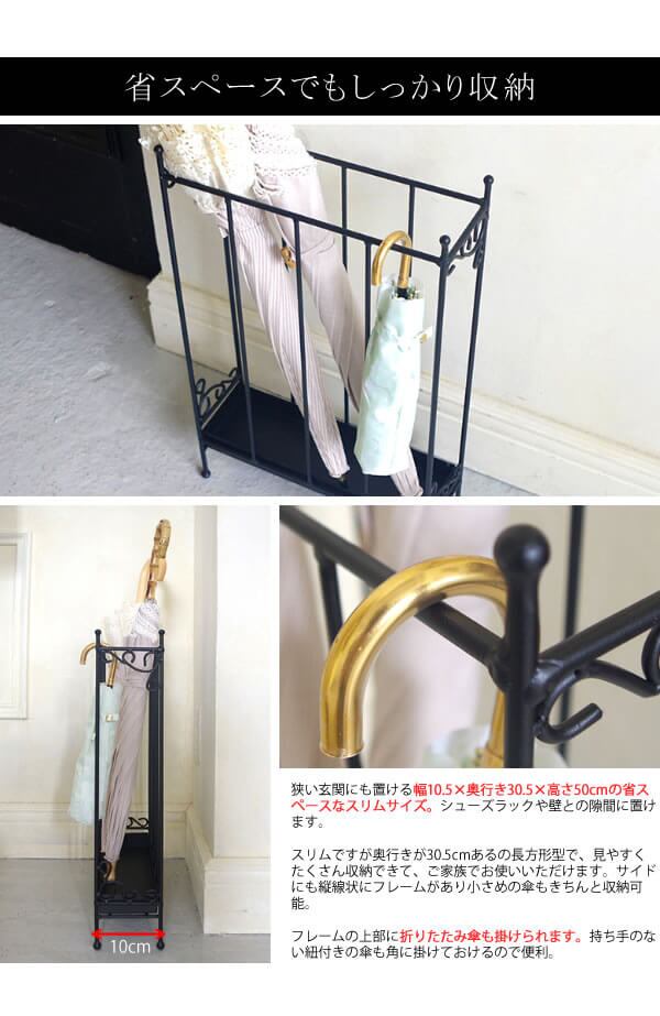 幅10.5cmの省スペースなコンパクトサイズで、シューズラックやドアとの隙間などに置けるうえに折りたたみ傘も掛けられる便利な傘立てです。