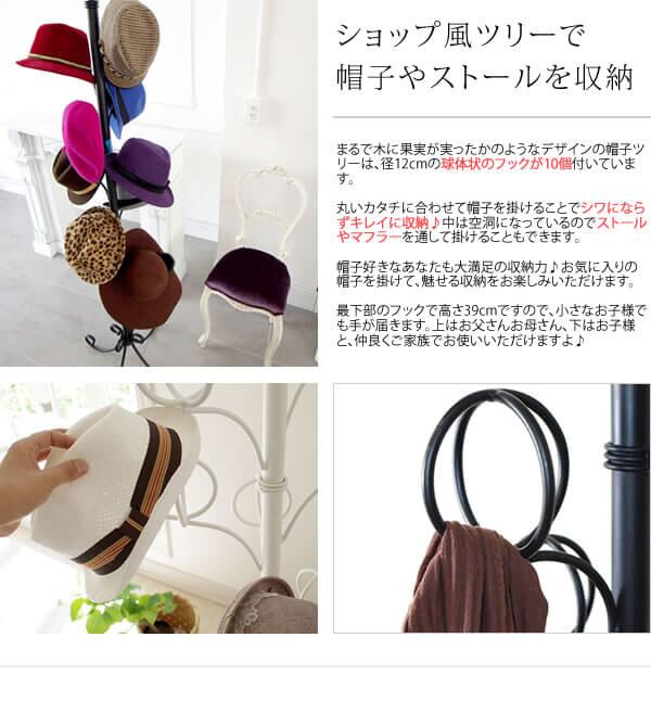 帽子の収納場所が確保できてデザイン性、利便性に優れたハットツリーは、置いてあるだけで、お部屋を華やかでオシャレなショップ風にしてくれます。