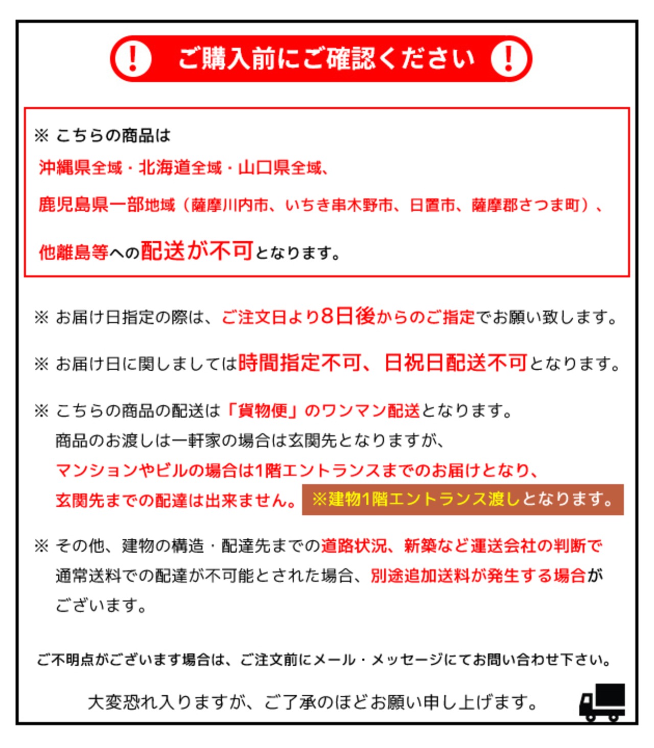■配送について:・配送不可地域(沖縄県全域・北海道全域・山口県全域・鹿児島県一部地域・他離島等)へのご注文は承りかねます。(※配送不可地域につきましては画像でもご確認ください。)